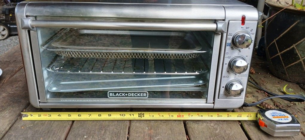 Only used a few months while oven was broken. Works great, just no longer need. Been sitting, will need cleaning. $60 OBO BLACK+DECKER Crisp 'N Bake Countertop Convection Toaster Oven, XL Capacity, Stainless Steel, Air Fry, 8-Slice, Fits 9" x 13" pan, 12" Pizza, 5-in-1, 6 1500 watts AIR FRY TECHNOLOGY: Deep fried taste without the fat! This innovative cooking method surrounds food with high intensity hot air to bake, brown, and crisp your favorite foods using little to no oil. 5 COOKING FUNCTIONS: Choose from five available cooking methods: bake, broil, toast, keep warm, and air fry. EXTRA LARGE CAPACITY: Cook for the whole family! This large capacity toaster oven fits a 9” x 13” pan with handles, 8 slices of bread, or a 12” pizza. COUNTERTOP BAKING: The Bake function and extra wide capacity let you make pizzas, brownies, casseroles, and so much more! Plus, it’s great for reheating leftovers without turning on the big oven. 60-MINUTE TIMER: The 60-minute precision timer is convenient for short and long cooking tasks.