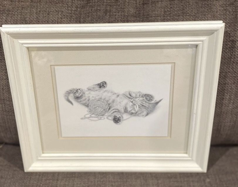 Pre Owned Precious Pencil Sketch Of A Kitten Playing With A Ball Of Yarn Framed