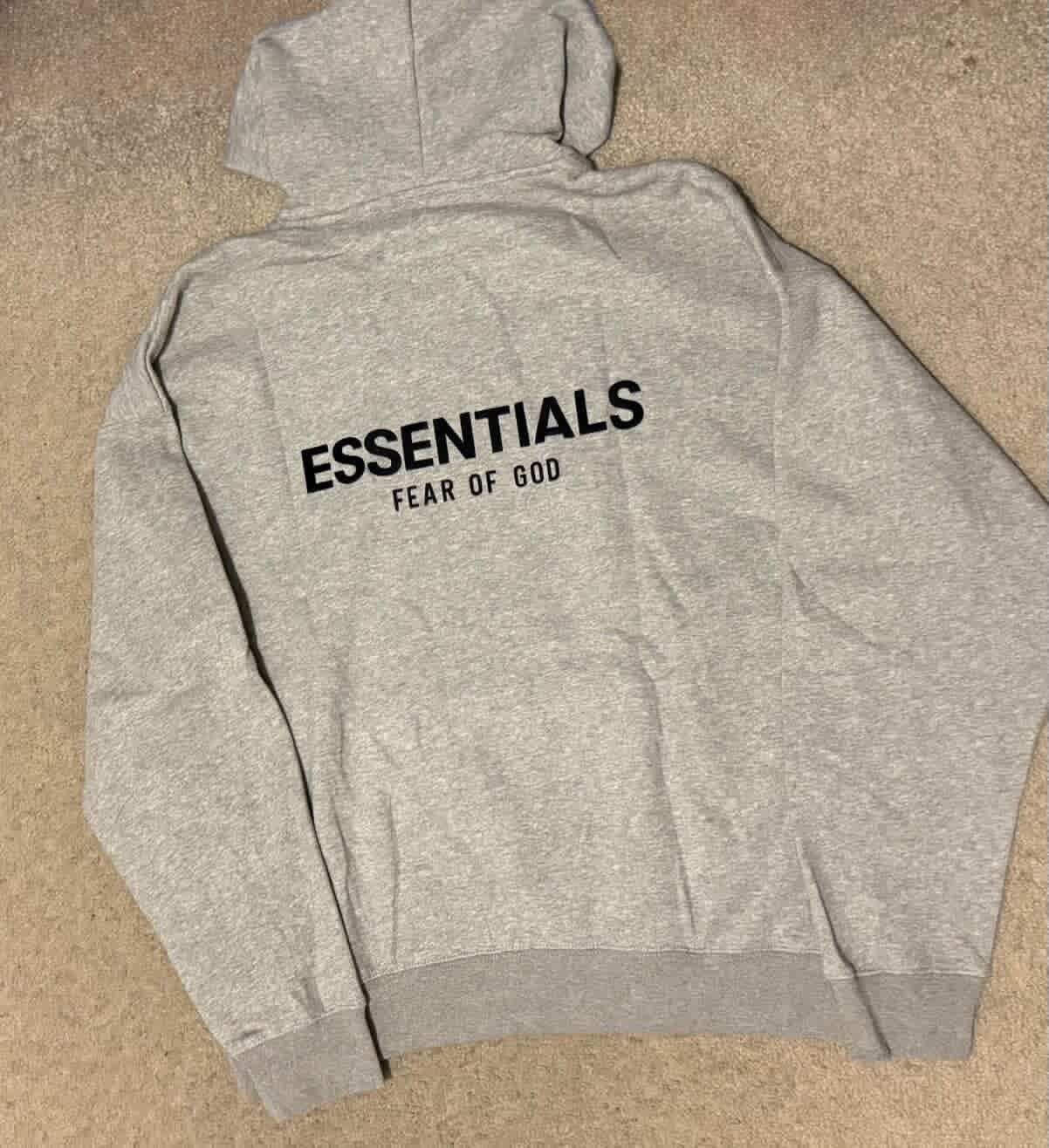 Authentic Fear of God Essentials grey hoodie. Features the signature ESSENTIALS logo branding, relaxed oversized fit, and soft cotton-blend fleece for comfort.