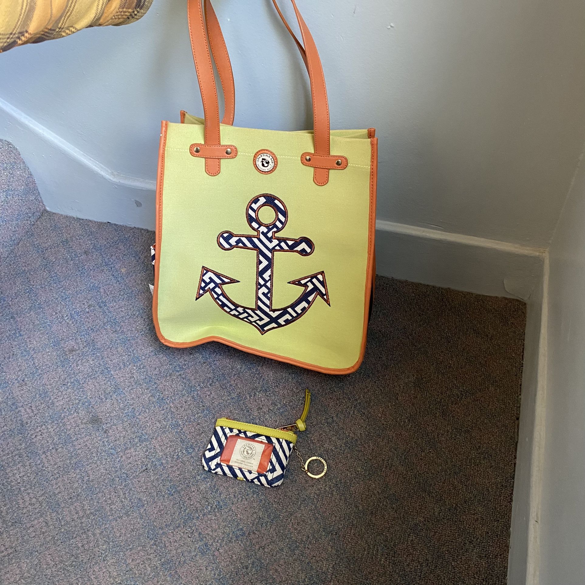 SPARTINA 449 Anchor LARGE Retired Tote Handbag Purse Shoulder Bag with Matching Wallet Great pre-owned condition. Bag is Lime Green fabric with Ora