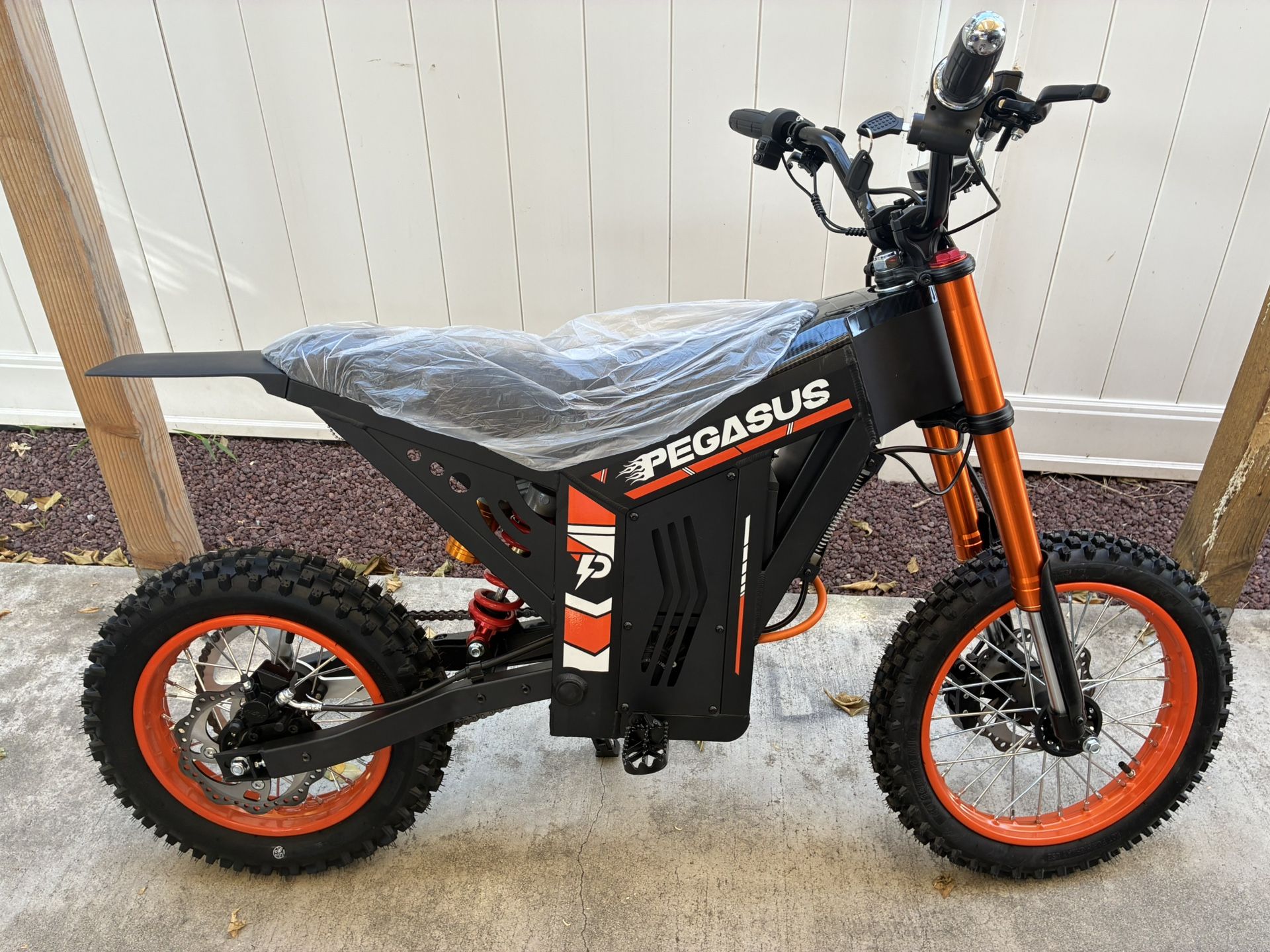 Brand new Pegasus electric dirt bike. No Trades. Firm price. Very similar to Tuttii Soleil01 at a fraction of the cost. They both share the same frame, seat, battery, motor, and other components. However, the Pegasus has some upgrades over Soleil 01. It has a reverse gear as well as front and side panels to better protect the battery. Comes with 2 keys and charger. 48v 21AH Battery 14" front wheel 12" rear wheel 2000W 37mph top speed