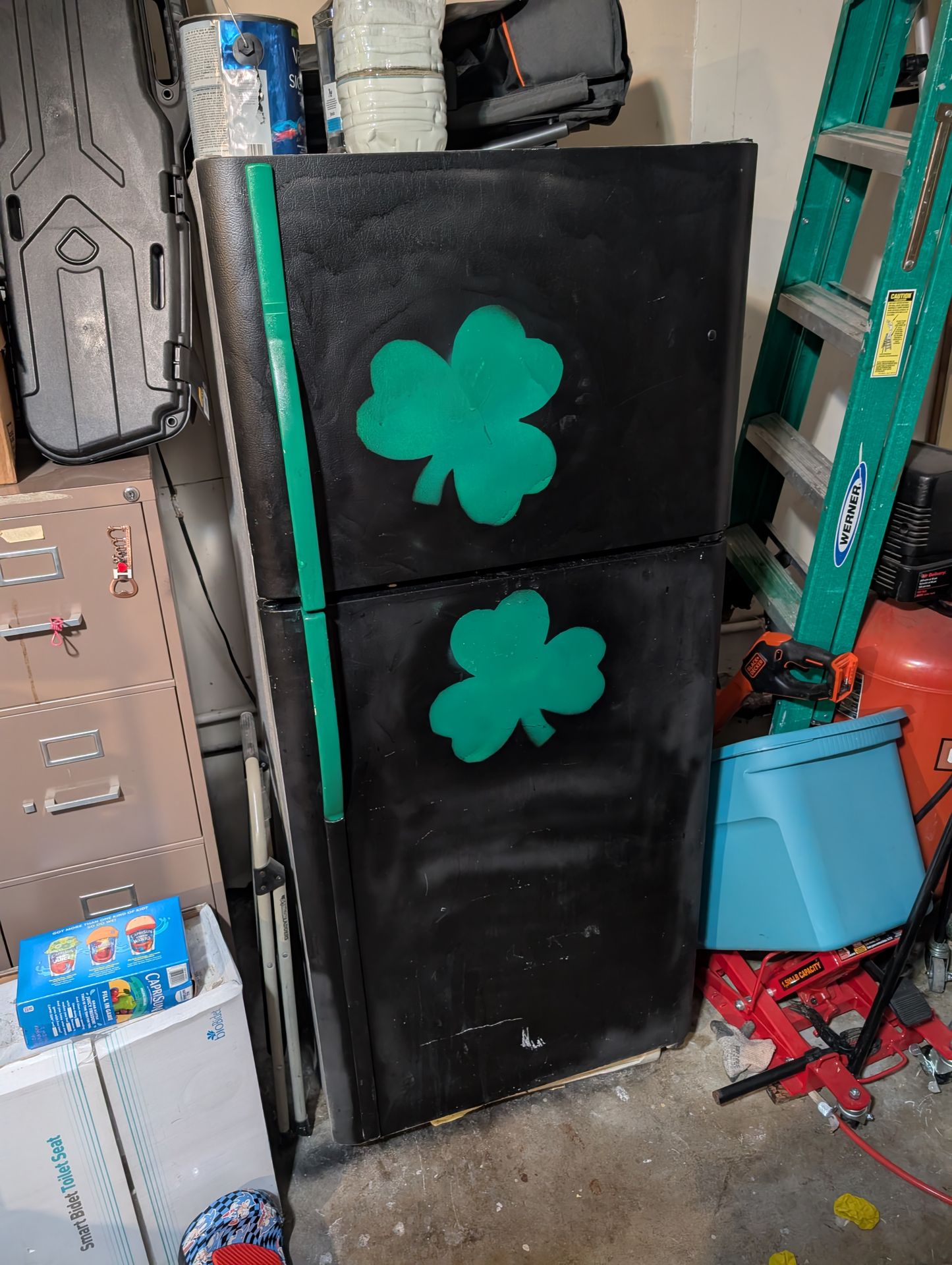 Just in time for St Patrick's day, works great. Full size white garage fridge custom painted to add luck! Comes with some free beer (21+) can deliver in Vacaville if needed
