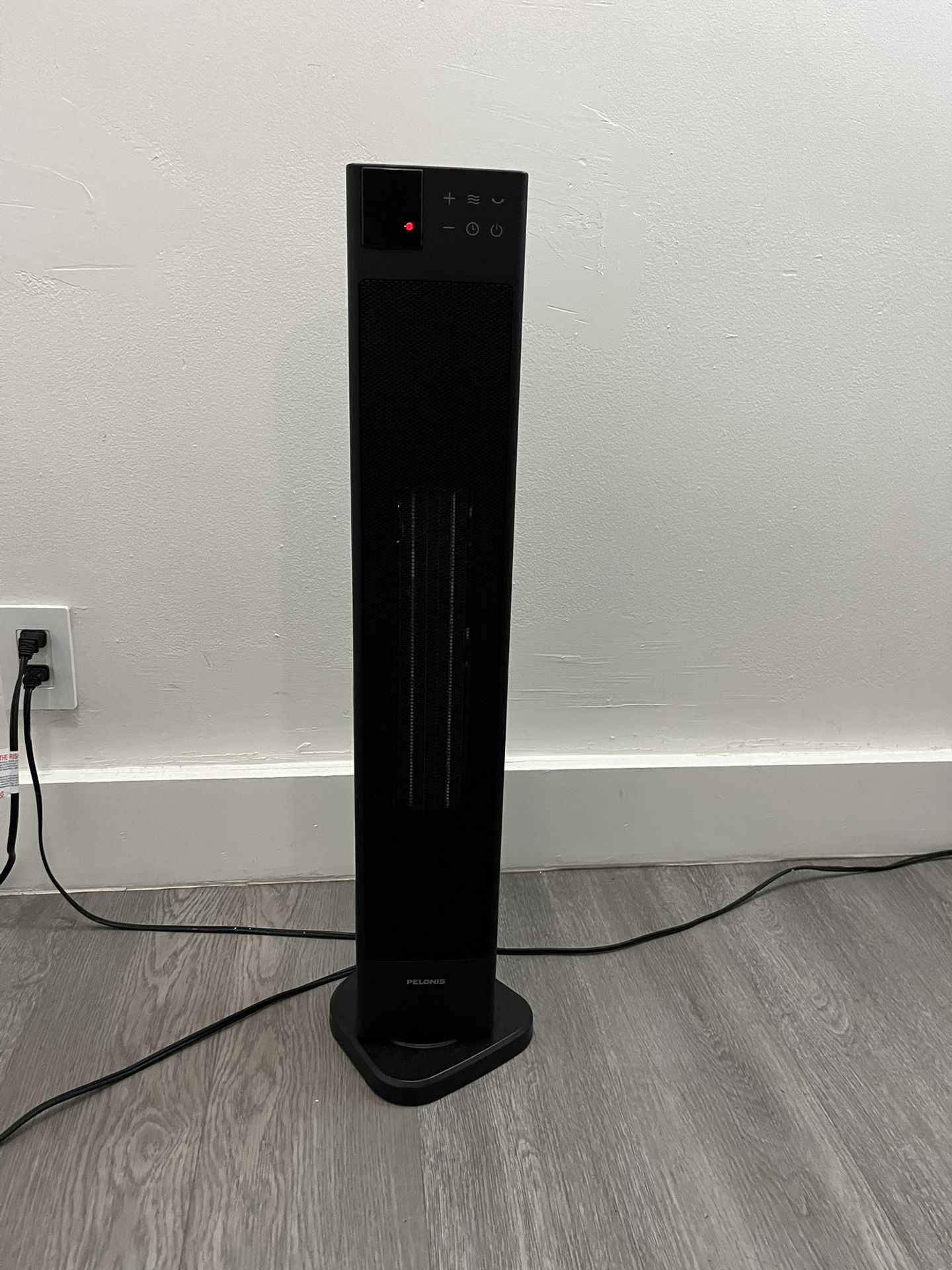 Pelonis heating tower is 30 inches tall and functions like new. Heats a room (door closed) very well in 20 degree weather. Works in open living rooms as well but the heat is felt best when in close proximity.