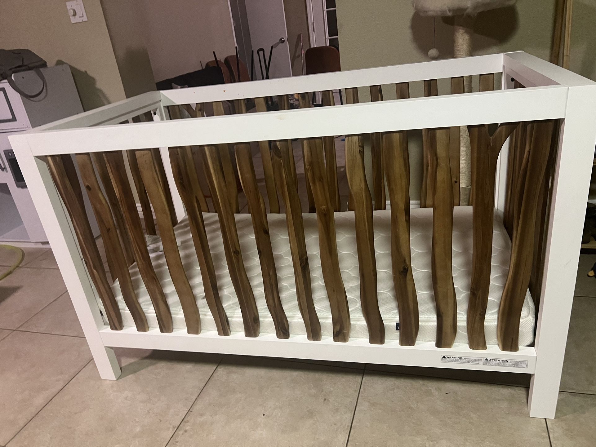Milk street branch baby crib. Real acacia wood. Halo dreamweave mattress. Matching changing table tray available too
