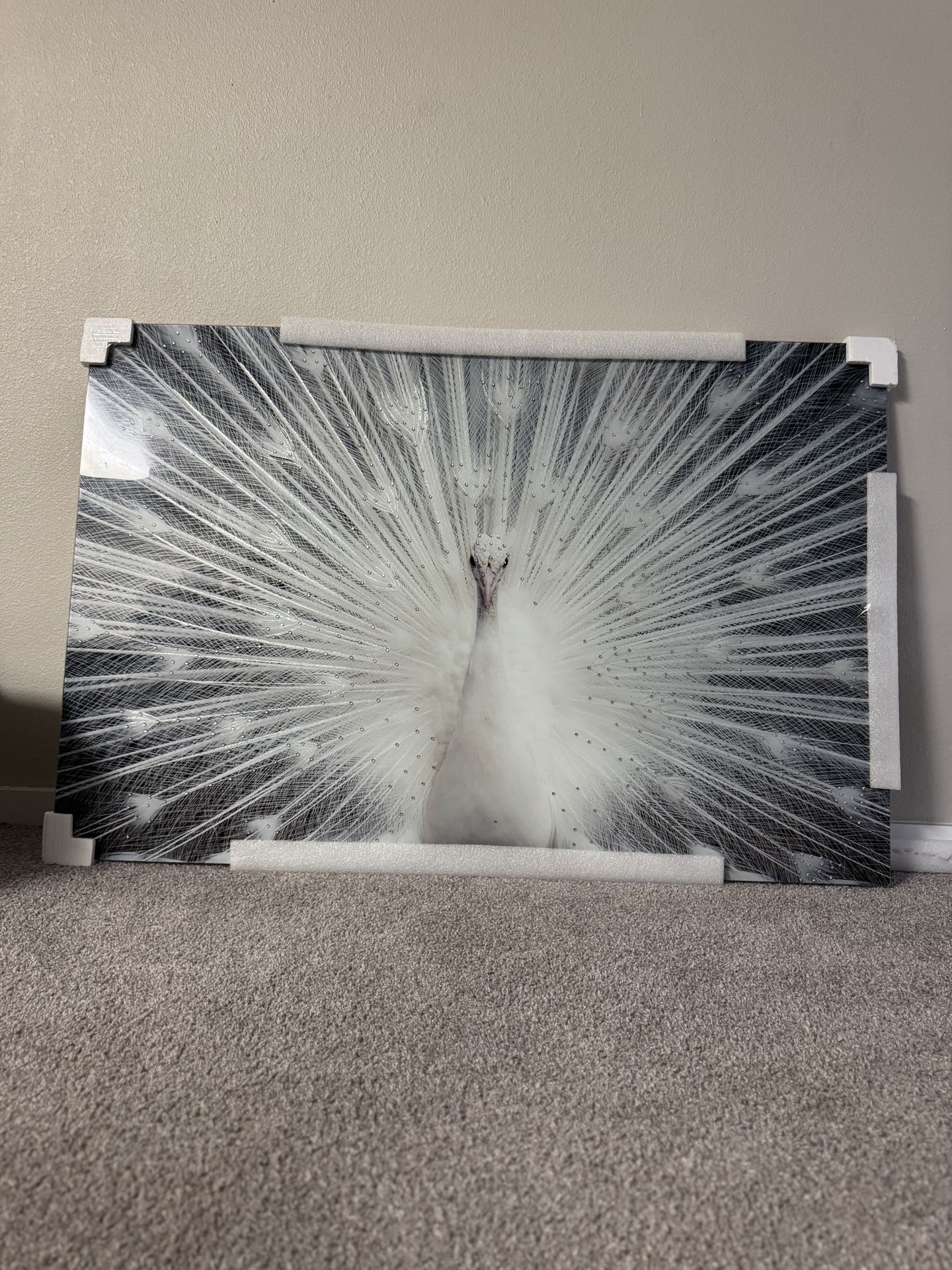 Tempered glass W/foil & RHINESTONES white peacock Wall FINE ART