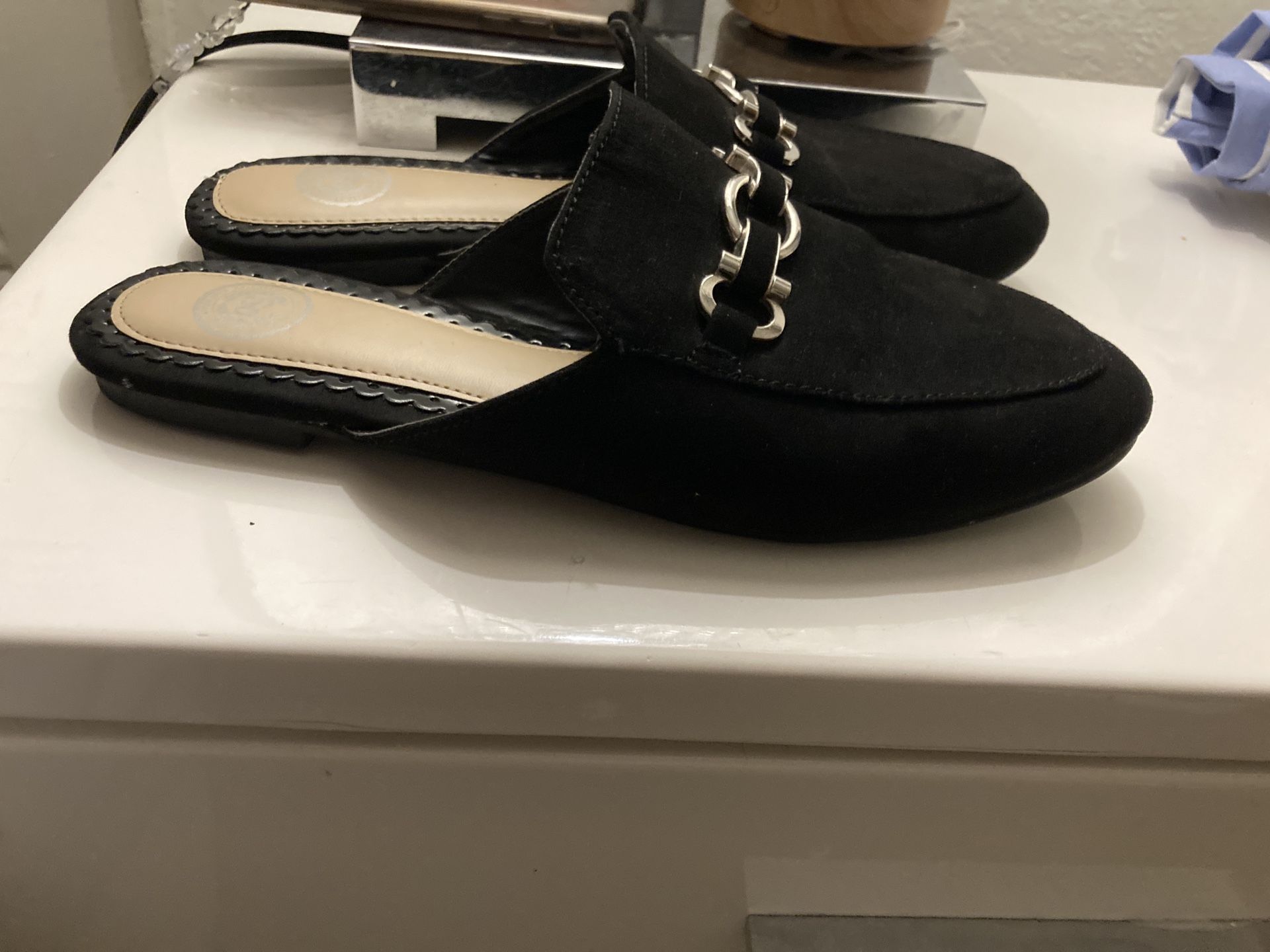 Stylish black loafers with chain detail, size 8.5 They are in excellent condition.