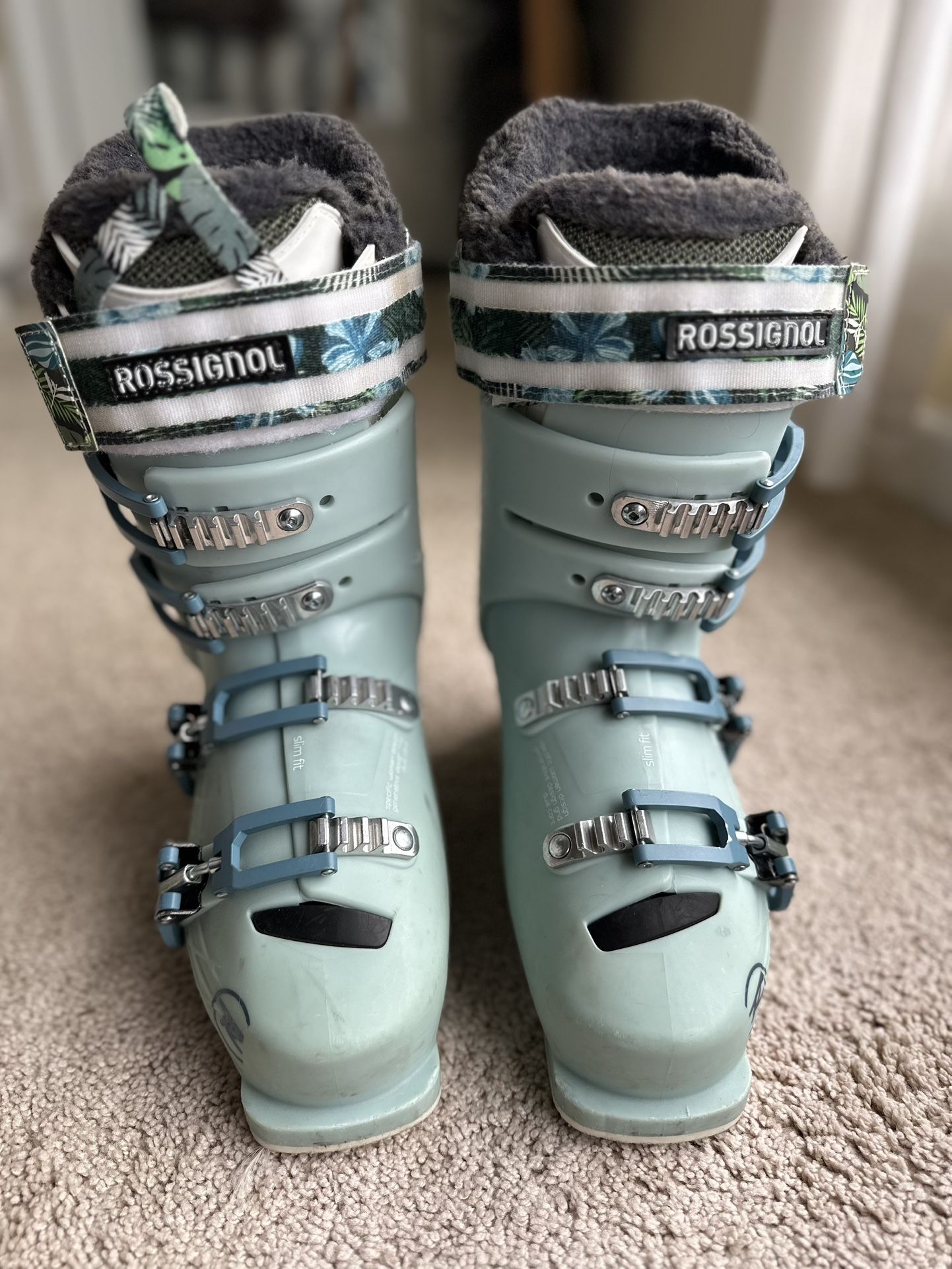23.5 Mondo (approximately US womens 7/7.5). 100mm width. Rossignol Dual Core shell and 110 flex offer transmission, rebound and support. Grip walk base. These boots were used 1.5 seasons but were never heat molded. Minimal wear. Ski/walk mode. Can adjust the incline of the boots with tools, as well based upon skiing conditions/preferences. Original retailed new at $750. Chance to own a great advanced boot with a lot of life left.