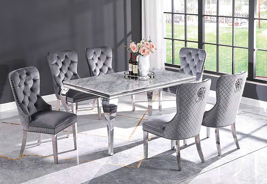 NEUVEVILLE 7 Pc. Dining Table Set, Black & gray Chairs, 79"L X 39"W X 3"H, 324.39lbs. Add not-so-subtle sophistication to your dining room with this bold table. The cabriole legs are definitely the eye-catching feature--each corner with curves reminiscent of classic pieces--only with the infusion of some contemporary flair in their bright chrome finish. Don't forget the beveled table top made of faux marble, durable and just as stunning. Combined with these elegant, button-tufted wingback chairs, it's a glam piece waiting to be part of your Hollywood dream home. Comedor de 7 Piezas Nuevo en Caja Entregamos a domicilio Color Gris y negro disponible
