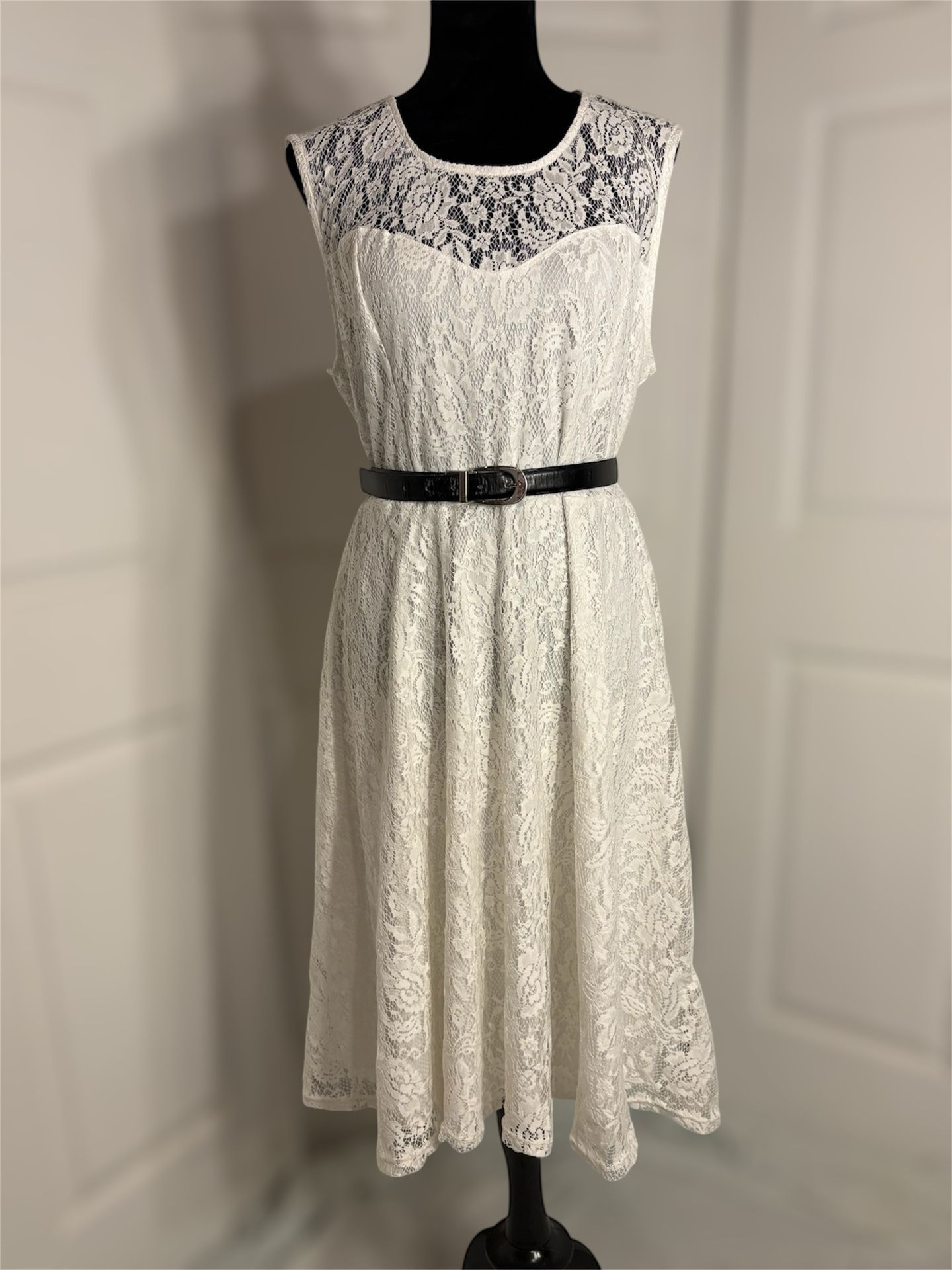 Soprano brand size 1XL dress. Sweet, simple, and versatile - any color belt or ribbon can be worn depending on the look you’re going for. Accessorize with a brown leather belt and cowgirl boots for country style. The tag says this dress is a 2XL. If that is true, it runs small and is definitely a XL.