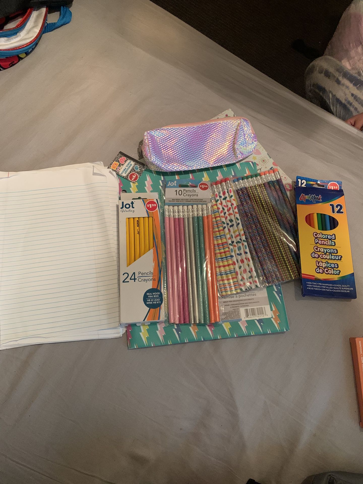 School supplies A few folders, lots of pencils Color pencils, a bag for the pencils Loose papers Take all for 10