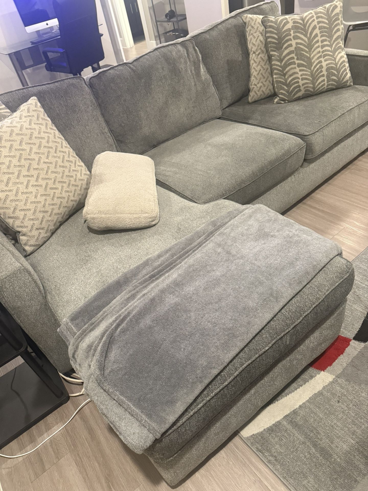 Selling my gray sectional with chaise. Pet-free, smoke-free home. Cushions are still supportive, fabric is clean, and the couch is very comfortable for lounging, gaming, or having company over. Details: • Color: Medium gray • Includes all pillows • Chaise can comfortably fit 1–2 people • No stains, no smells, no sagging cushions • From a clean, well-kept apartment • Only reason for selling: upgrading to a new couch Dimensions (approx.): Width: 98” Depth: 42” (67” with chaise) Height: 37.5”
