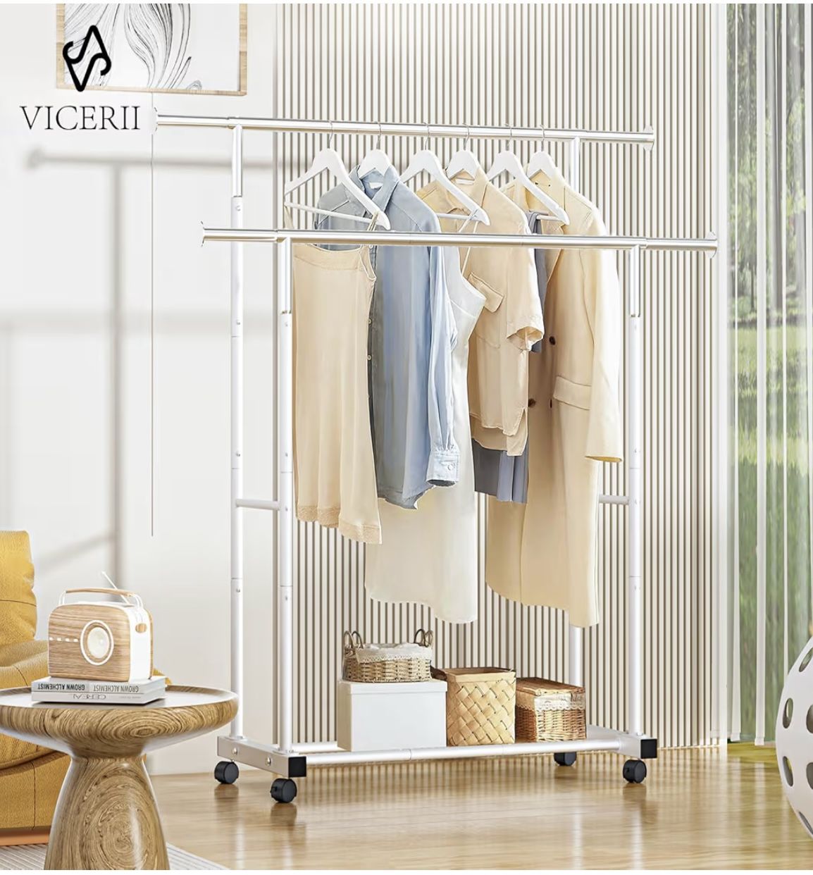 Double Clothing Rack, 55.51 Inch Garment Rack with Wheels and Bottom Shelf, 130LB Capacity Heavy Duty Rolling Clothes Racks for Hanging Clothes, Coats, Shirts, Sweaters, Skirts, White