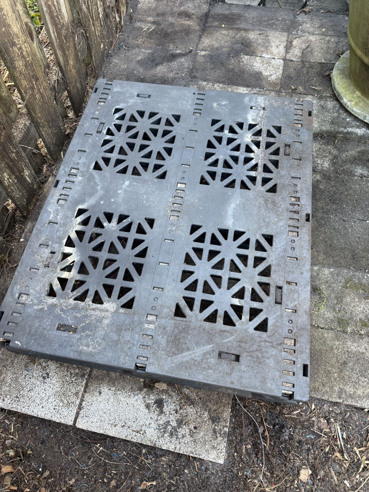 Set of two heavy-duty plastic pallet platforms. Industrial-grade molded plastic designed to keep items elevated off the ground. Great for garages, sheds, warehouses, or outdoor storage where you need airflow and drainage underneath.