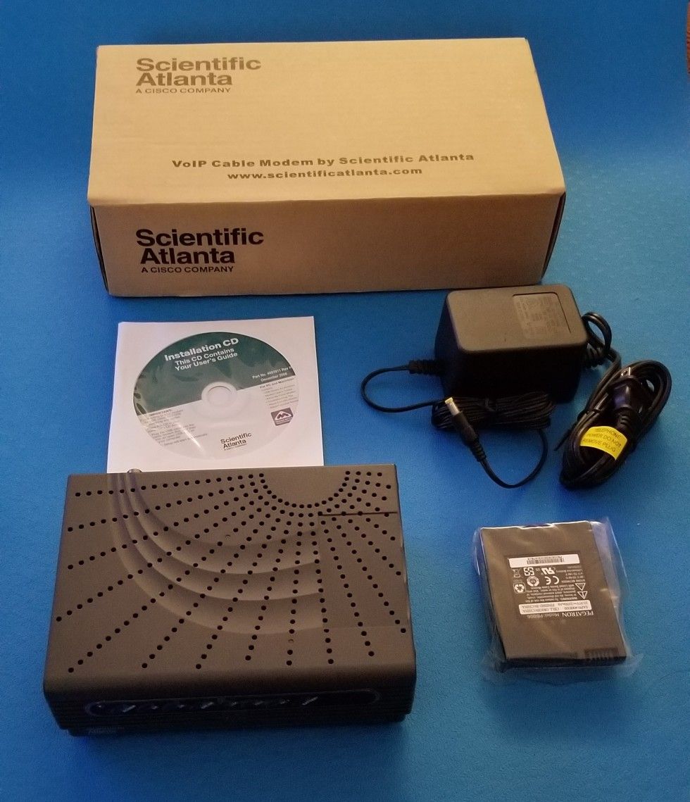 VoIP Cable Modem. Complete set includes battery, AC adapter power cord, and installation CD.