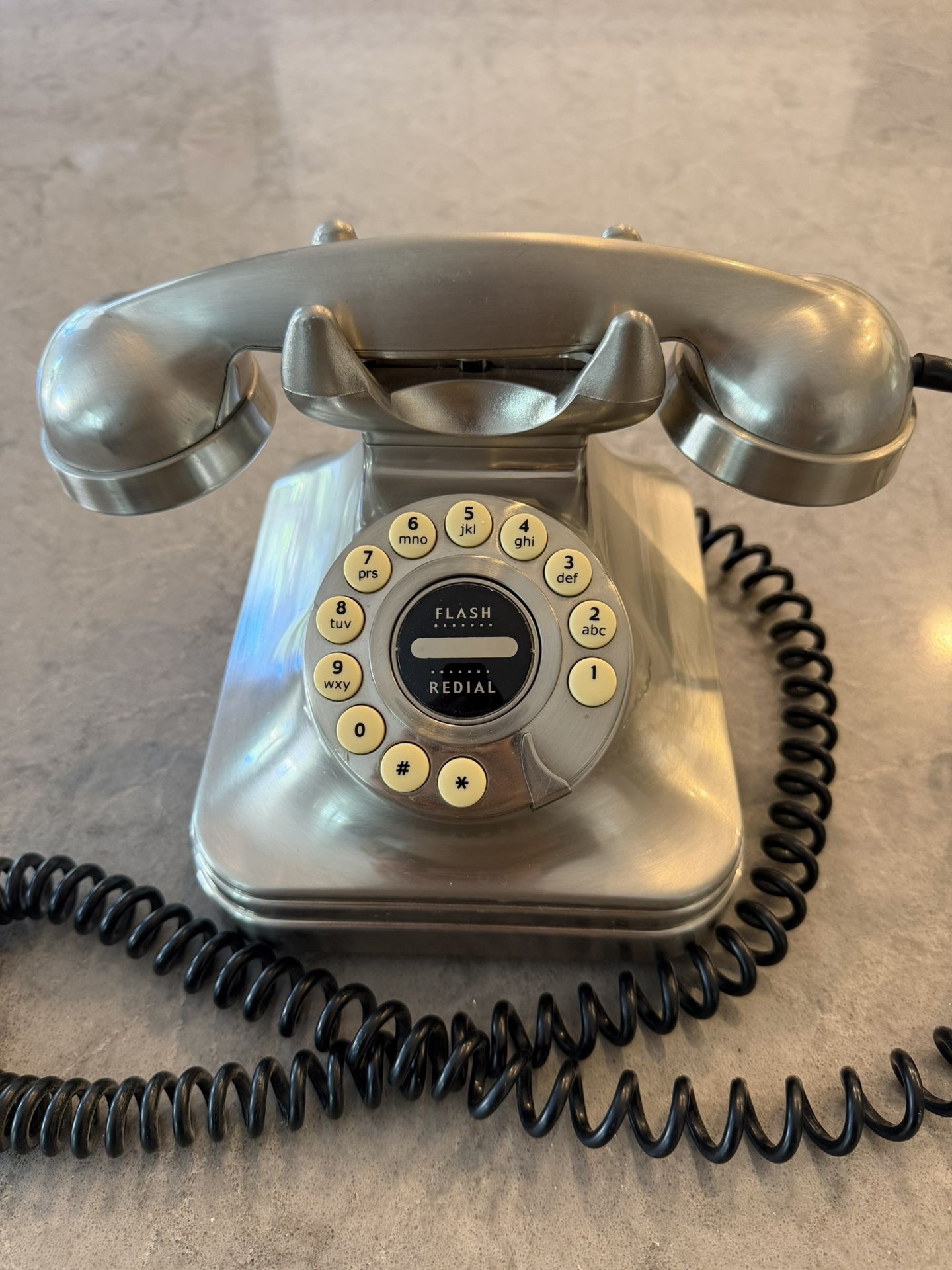 The "Grand Phone” by Pottery Barn Model No. LW121977 Color: Stainless Steele Vintage-style corded landline phone, features retro design with modern push-button functionality, redial, and flash. Heavy, solid feel. In working condition if plugged to a landline for service. Can also be used just as an interesting decorative piece of retro charm for any room or office.