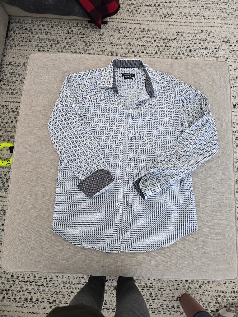 Mens Bugatchi dress shirt. Black theme, but with the red and blue accents, can also appear blue. Accents inside sleeves and color. Size Medium. Shaped fit. Very nice.
