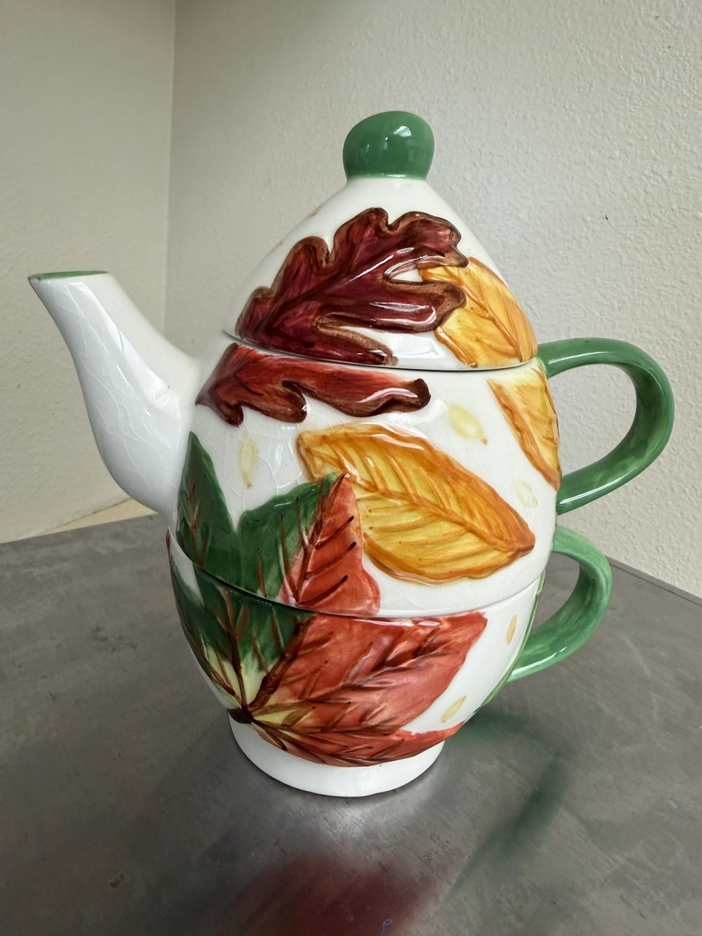 Enhance your tea time experience with this beautiful Bella Casa by Ganz Tea For One Stackable Teapot & Cup Set. The set comes with a teapot and a cup, all made of high-quality ceramic material and adorned with a stunning Fall Leaves pattern. The teapot comes with a lid to keep your tea hot, and both the teapot and cup are stackable for easy storage. no chips in perfect condition.