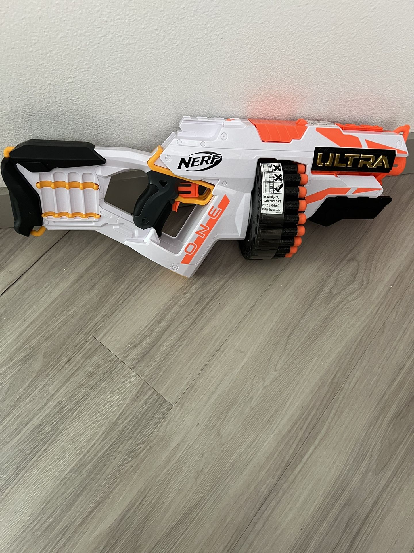 Perfect condition. Has about 20 darts . No batteries NERF Ultra One Blaster • Type: Motorized flywheel dart blaster • Series: NERF Ultra • Capacity: Comes with a high-capacity 25-dart drum • Darts Used: NERF Ultra darts only (special foam with fins for distance and speed) • Features: • Long-range firing (up to ~120 feet) • Built-in dart storage in the stock • Requires batteries (usually 4 C batteries)