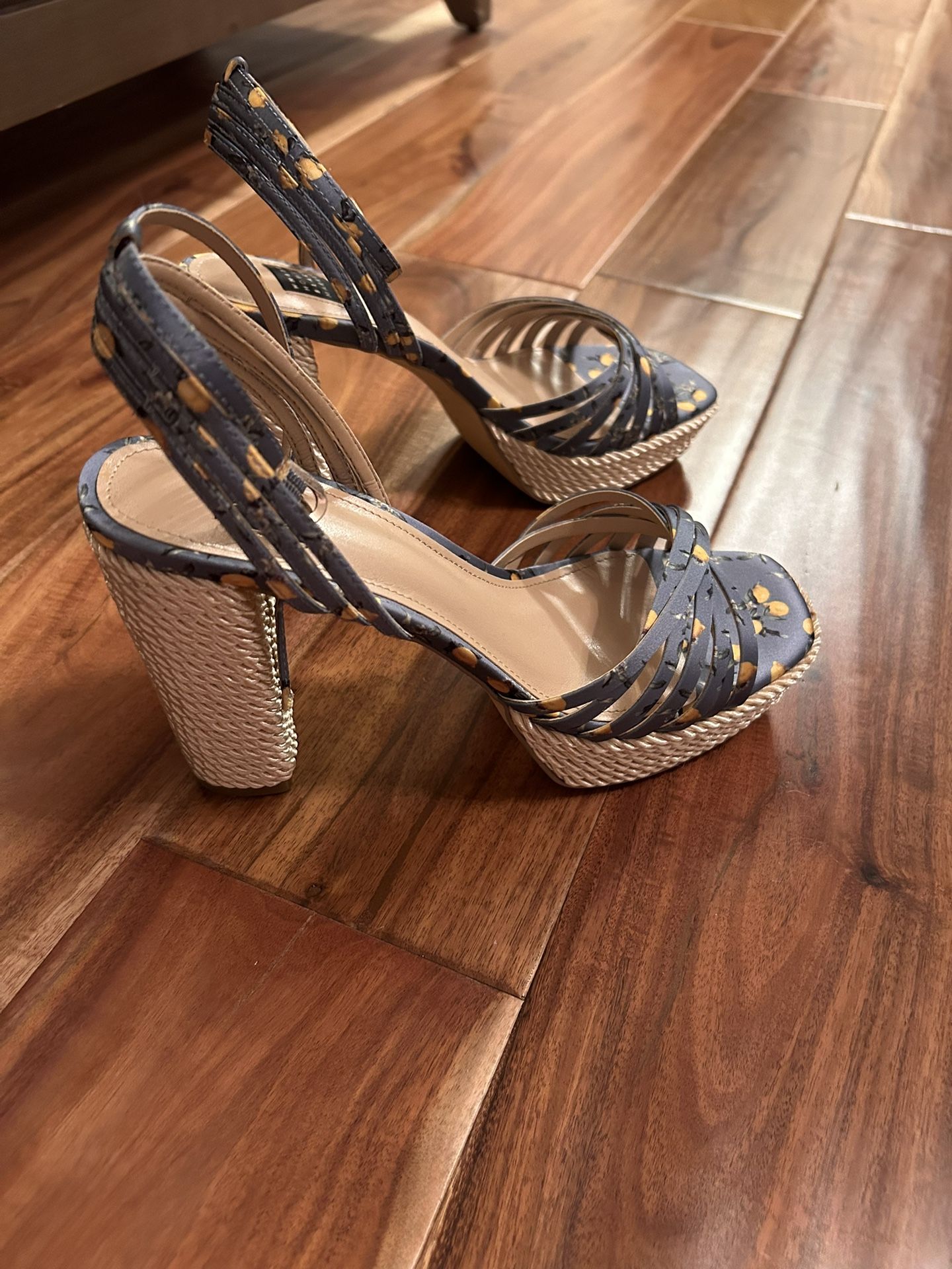 White House Black Market blue with lemon print sandals. Look like new. Worn only once. Size 7 1/2.