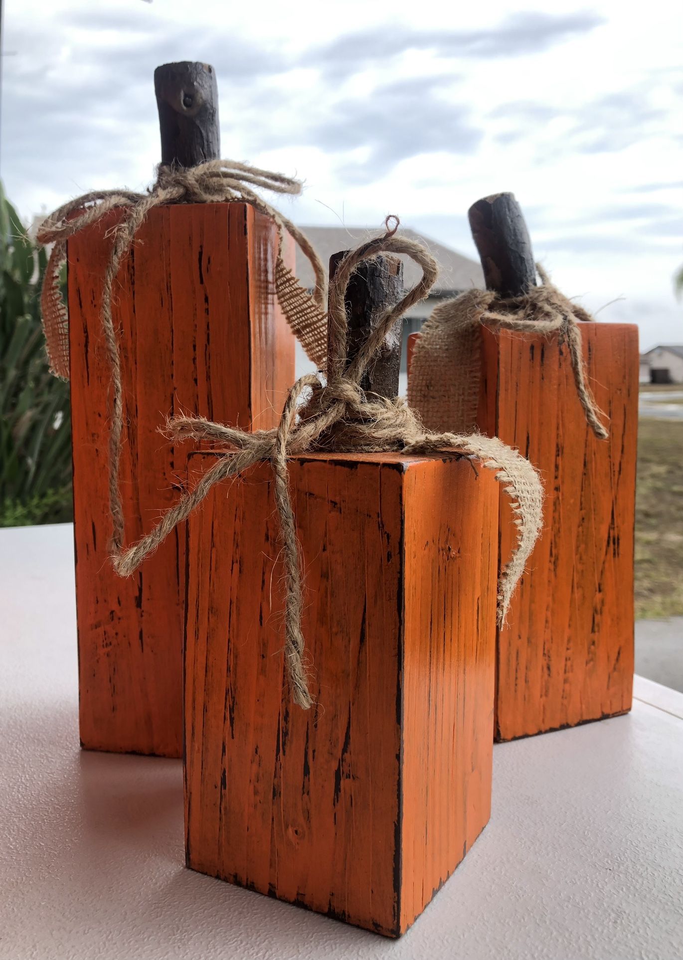 Set of 3 wooden pumpkins for $15. Handmade and stand independently. 3 1/4” W x 3 1/4” D x 6” H, 3 1./4” W x 3 1/4” D x 8” H, 3 1/4” W x 3 1/4” D x 10” H. Hand painted and sealed with Polycrylic protective finish.