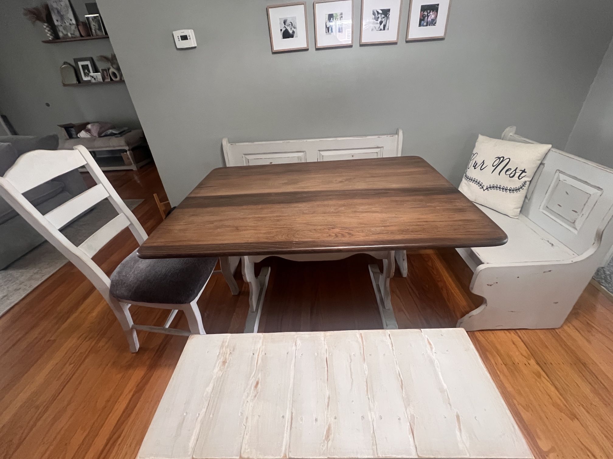Charming farmhouse dining set. Has a dark wood table top with distressed white base. Comes with two matching distressed white benches with storage, one small bench and one chair. Table is about 30 inches tall and 48 x 35 inches. $250 or best offer. Pick up only.