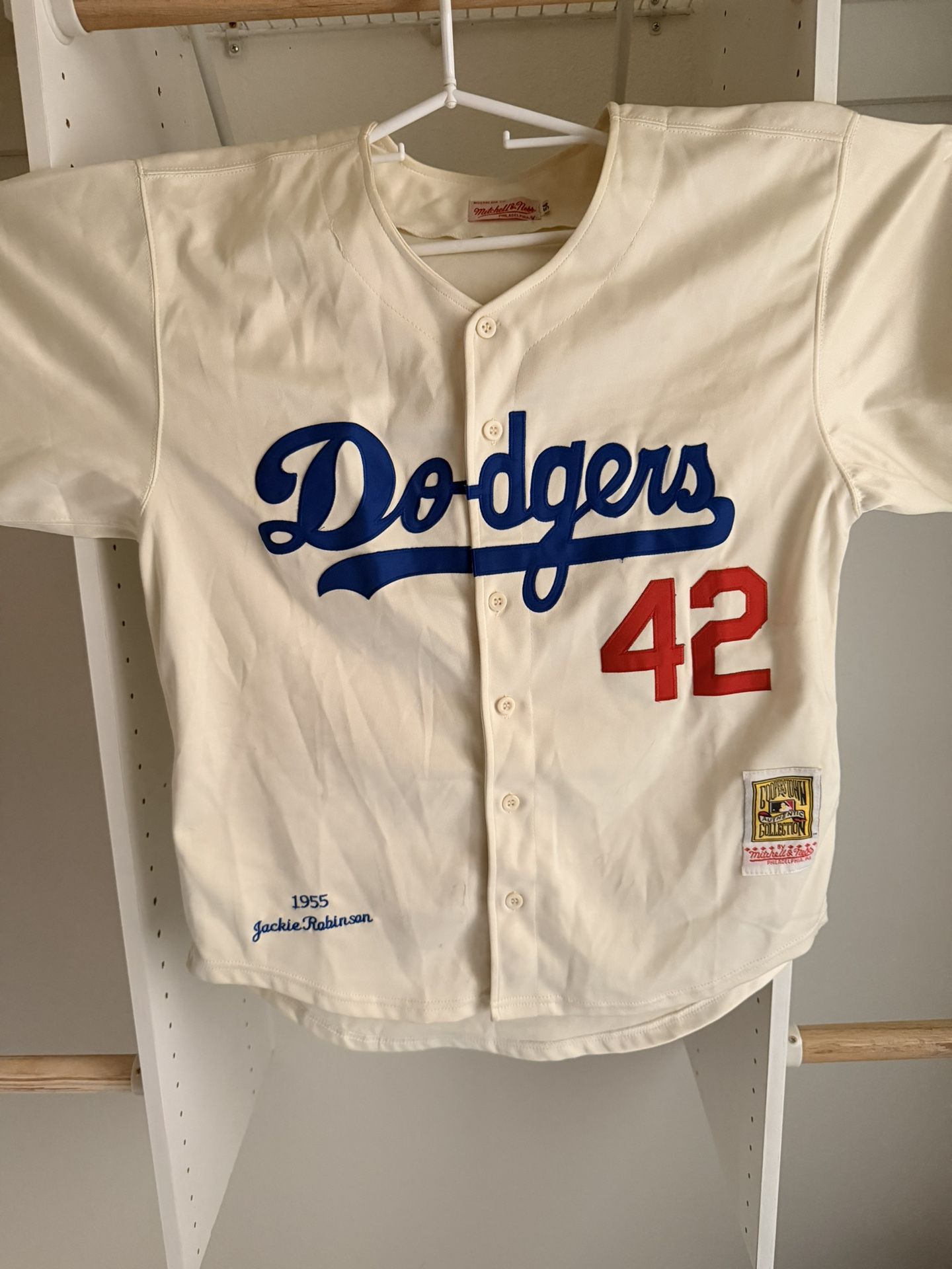 Jackie Robinson throwback cream color Mitchell & Ness jersey. Worn a few times, great condition. Normal length, it’s not a longer length. Everything stitched. Very clean.