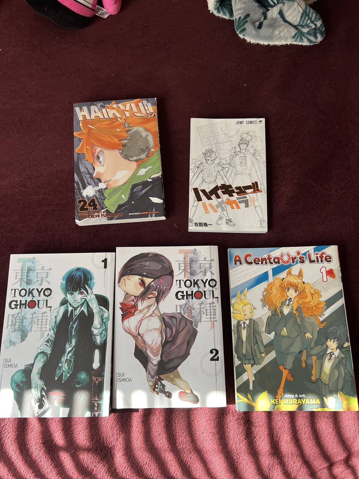 Tokyo ghoul (Volumes 1&2) selling for 20 both but each is 10 A centaur life Volume 1 (selling for 5) Haikyu Volume 24 & art book (selling for 13)