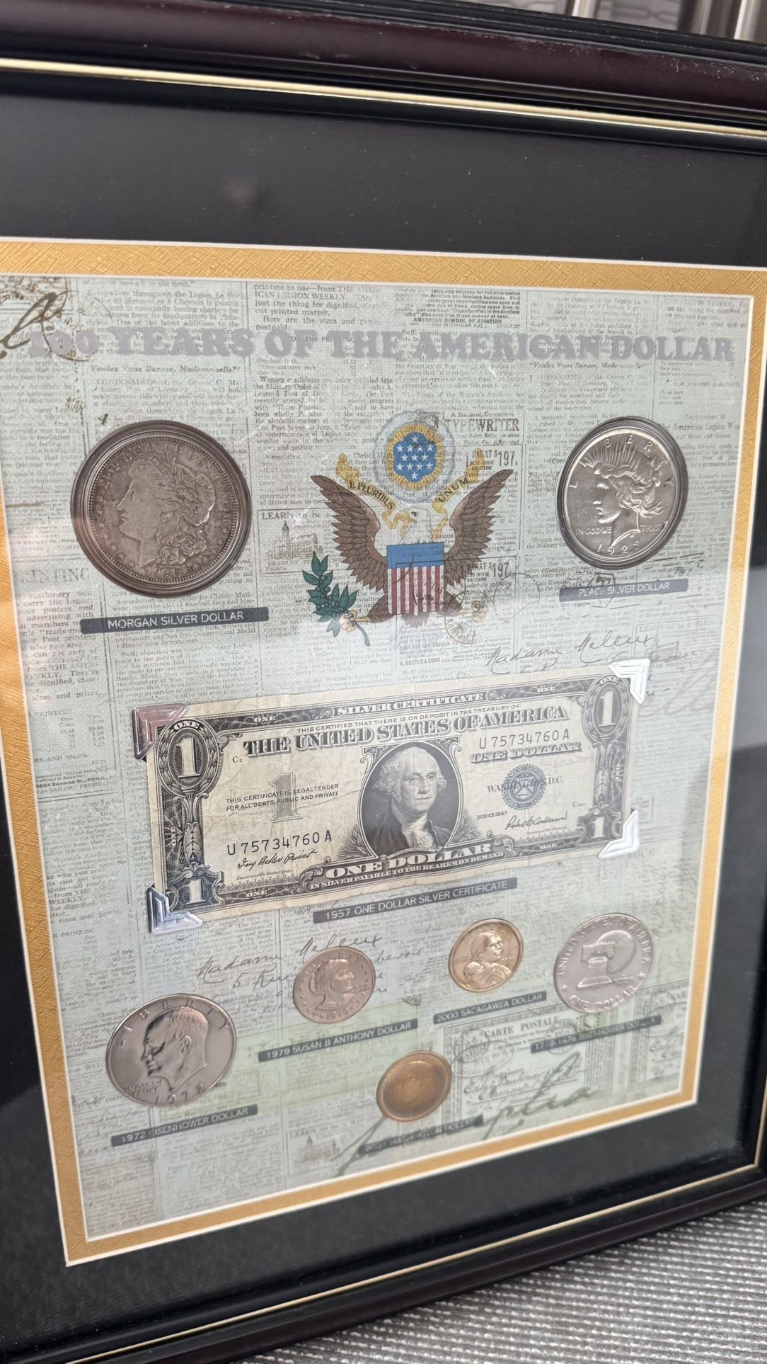 Vintage US coin and currency set, including silver peace and silver Morgan dollars. 1 1957 silver Certificate