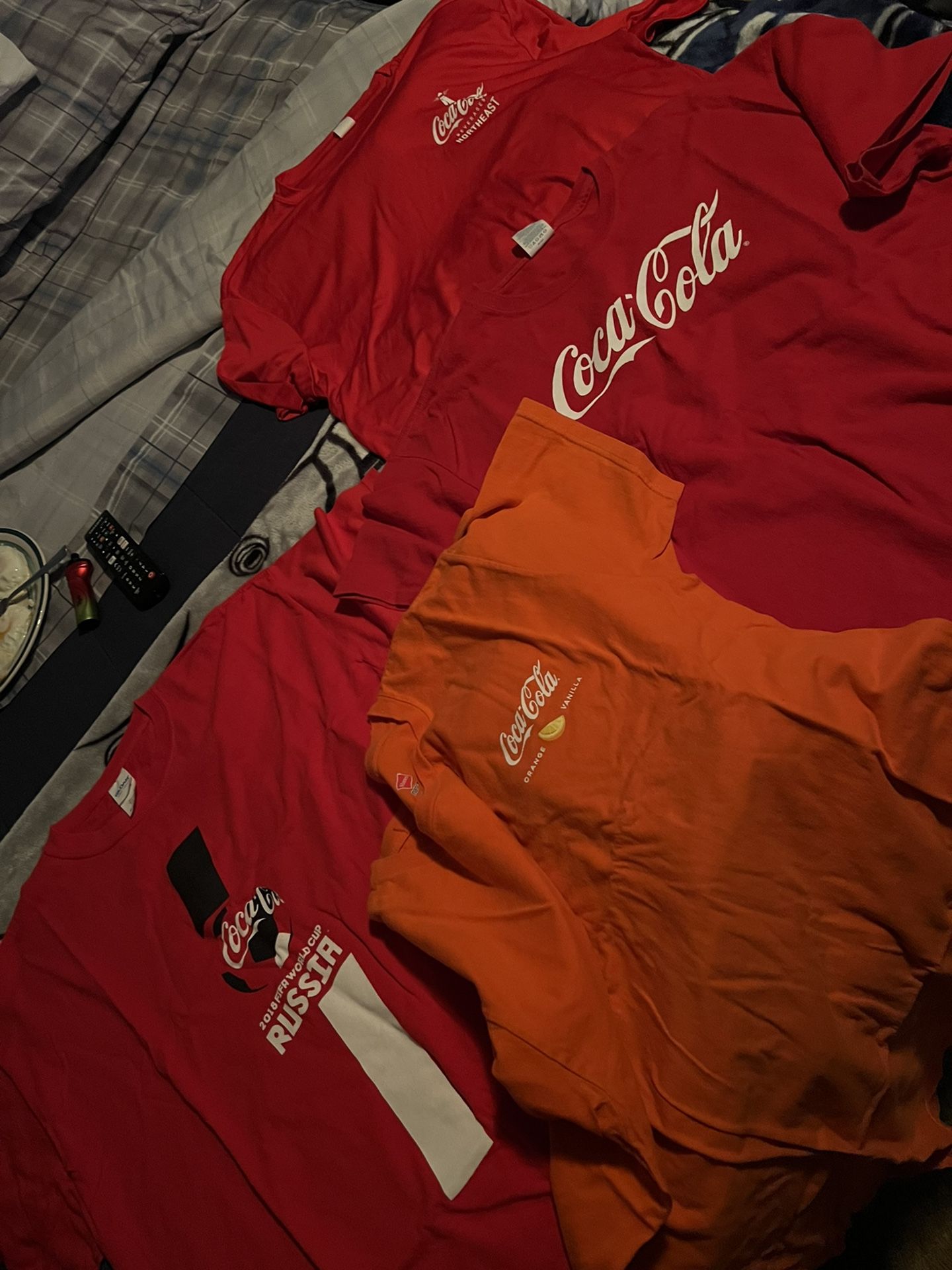 Use to work for Coca Cola I have about 40-50 tshirts, and sweaters and a jackets ….some dri fit shirts , Nike coke sweater some brand new some worn few times all washed with smoke free house ready to wear