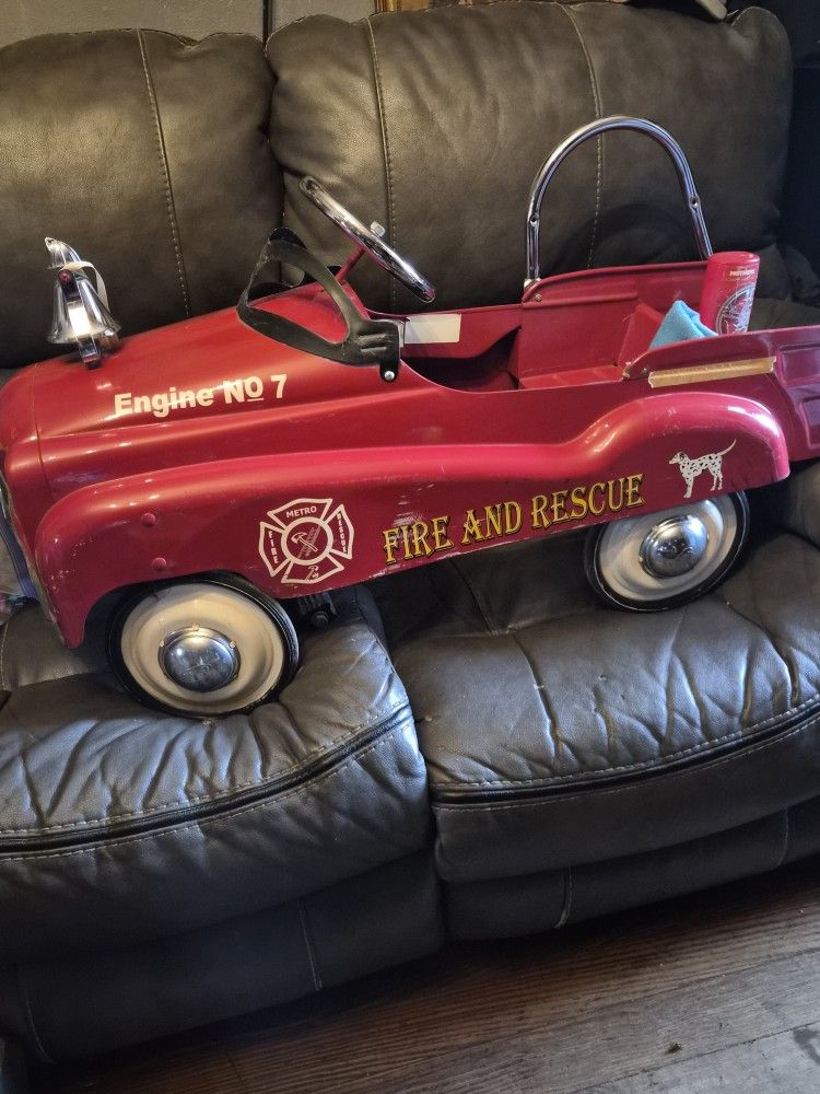 Classic all-metal fire engine pedal car with metal body, wheels, steering wheel, bell, and roll bar. Marked “Engine No. 7” and “Fire and Rescue.” Solid and heavy—not plastic. Shows normal wear from age, adding great vintage character. Rolls and steers; pedals present (function not guaranteed). Excellent for collectors, display, or restoration. Sold as-is. Local pickup preferred.