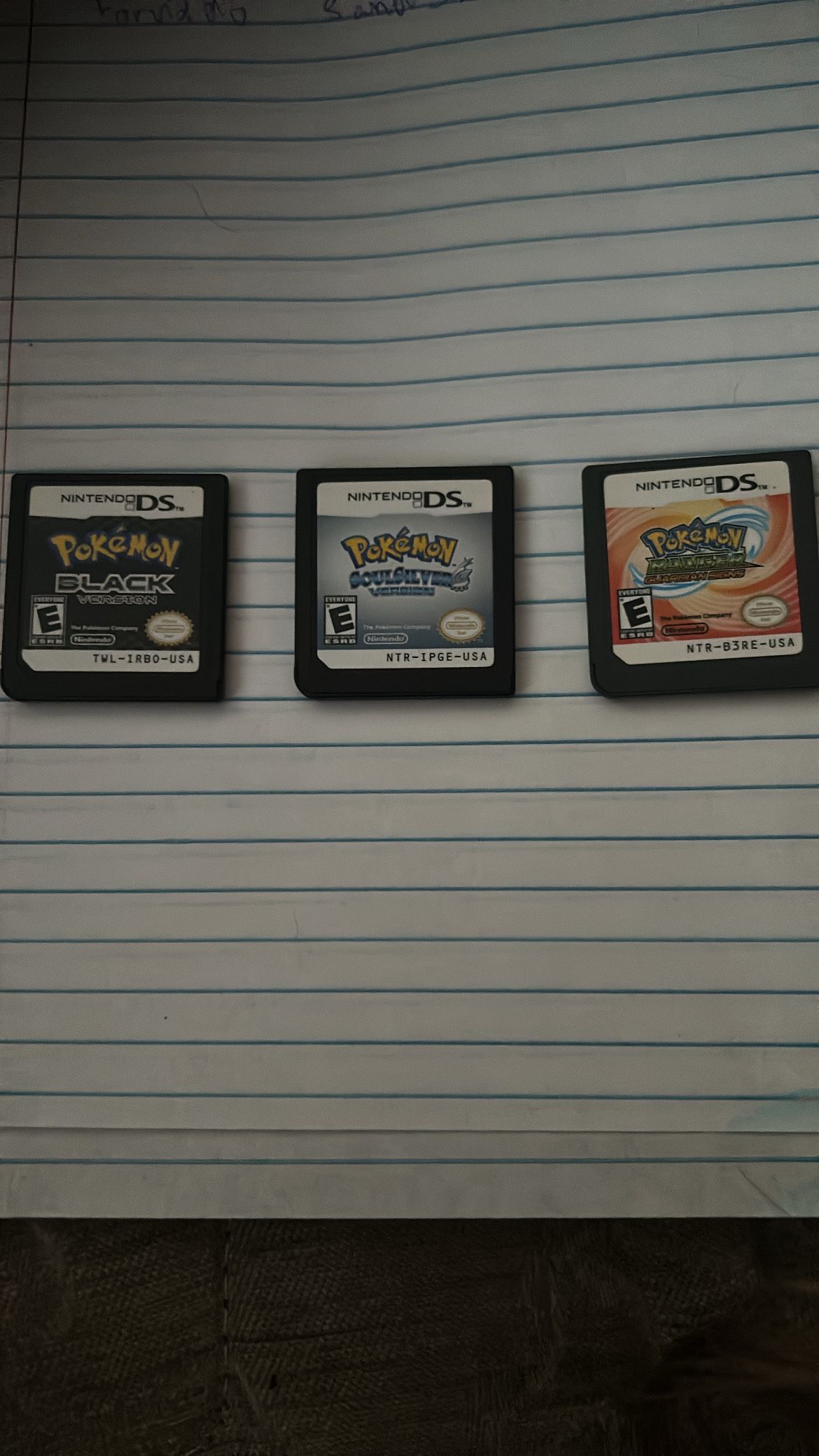 Authentic Pokemon Black Version, Pokemon SoulSilver and Pokemon Ranger Guardian Signs. Great condition no game cases for them, labels on them are perfect, fully tested and run great looking for $210 for the 3 together or will sell separately Pokemon SoulSilver Version - $115 Pokemon Black Version - $70 Pokemon Ranger Guardian Signs - $25 I can deliver or meet up whichever would be preferred.