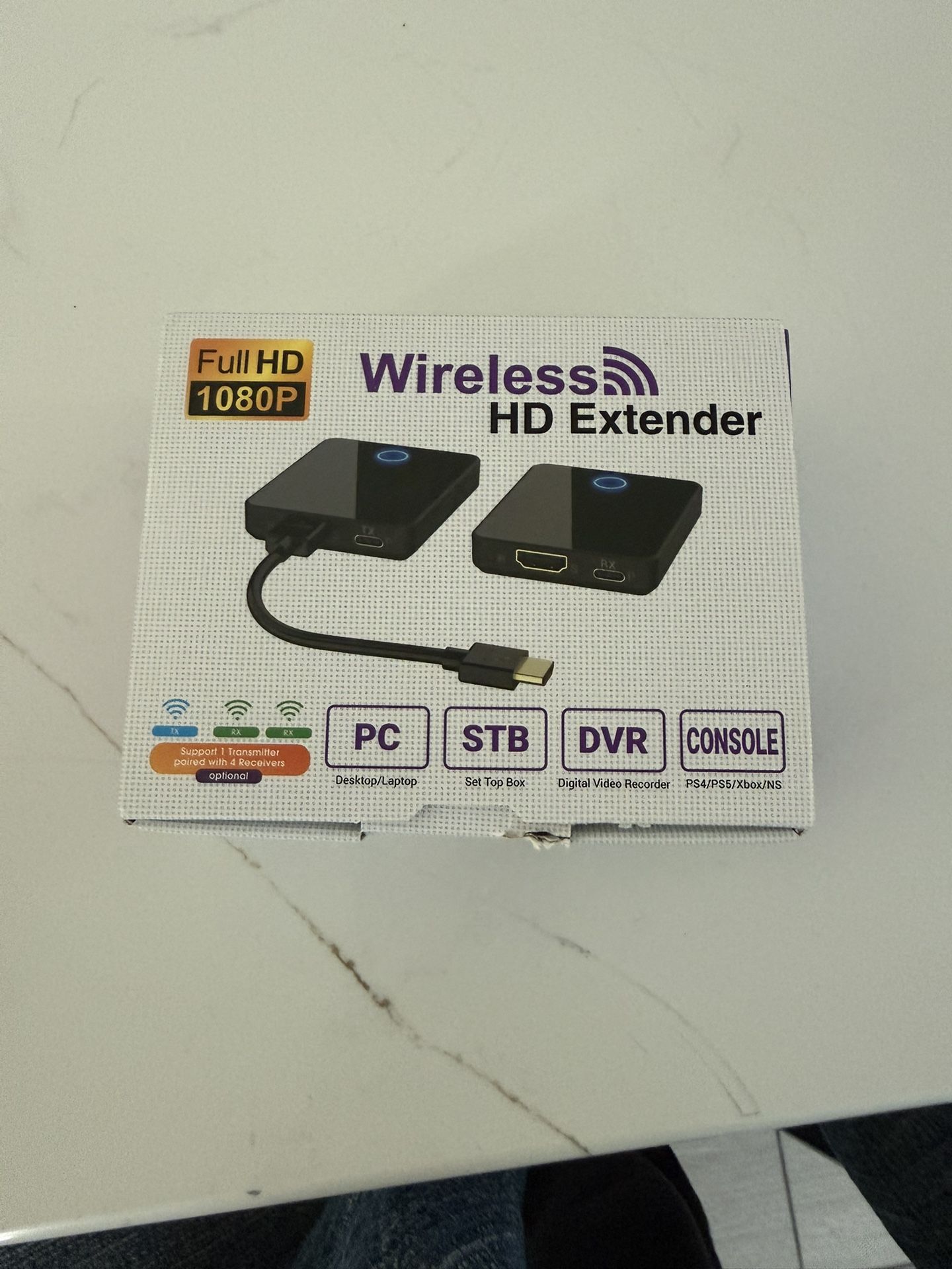 Brand new wireless HD extender. Full HD 1080P resolution. Works with PC, laptop, set top box, DVR, gaming consoles (PS4/PS5/Xbox/NS). Has a transmission distance of 20-30 meters in open space. Super easy plug and play setup. Comes with transmitter, receiver, USB to DC cables, HDMI cables. Compact size, about 66x55x13mm.