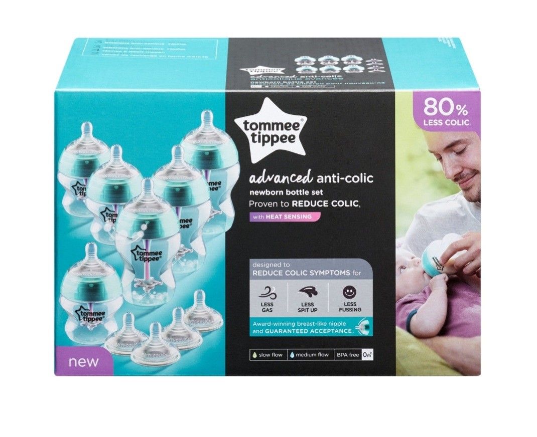Set in box is new. Set in box contains 3-5oz bottles, 3-9oz bottles with slow flow nipples, 4 new medium flow nipples and 2 extra valves. The 5oz bottles were sterilized but never used. The 9oz bottles are still in original sealed packaging. I have included 2 extra 5oz bottles that were also sterilized but never used. Tommie tippie microwave sterilizer included