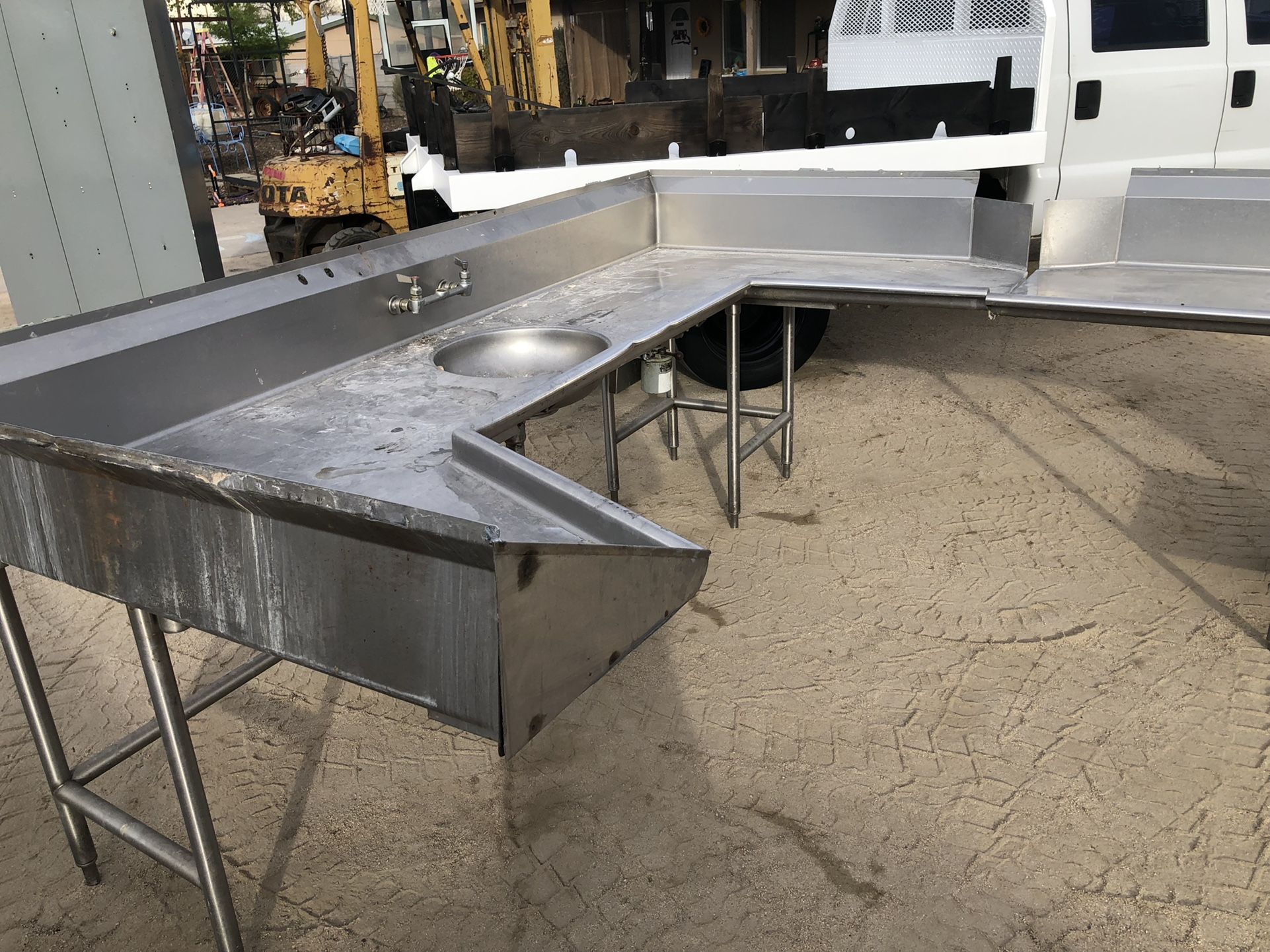 L shapers sink stainless is 12’6 one side and 9’ 6 on Thea other it’s in 2 pieces Dishwasher sold Asking $500 for all of it thank I have forklift to load