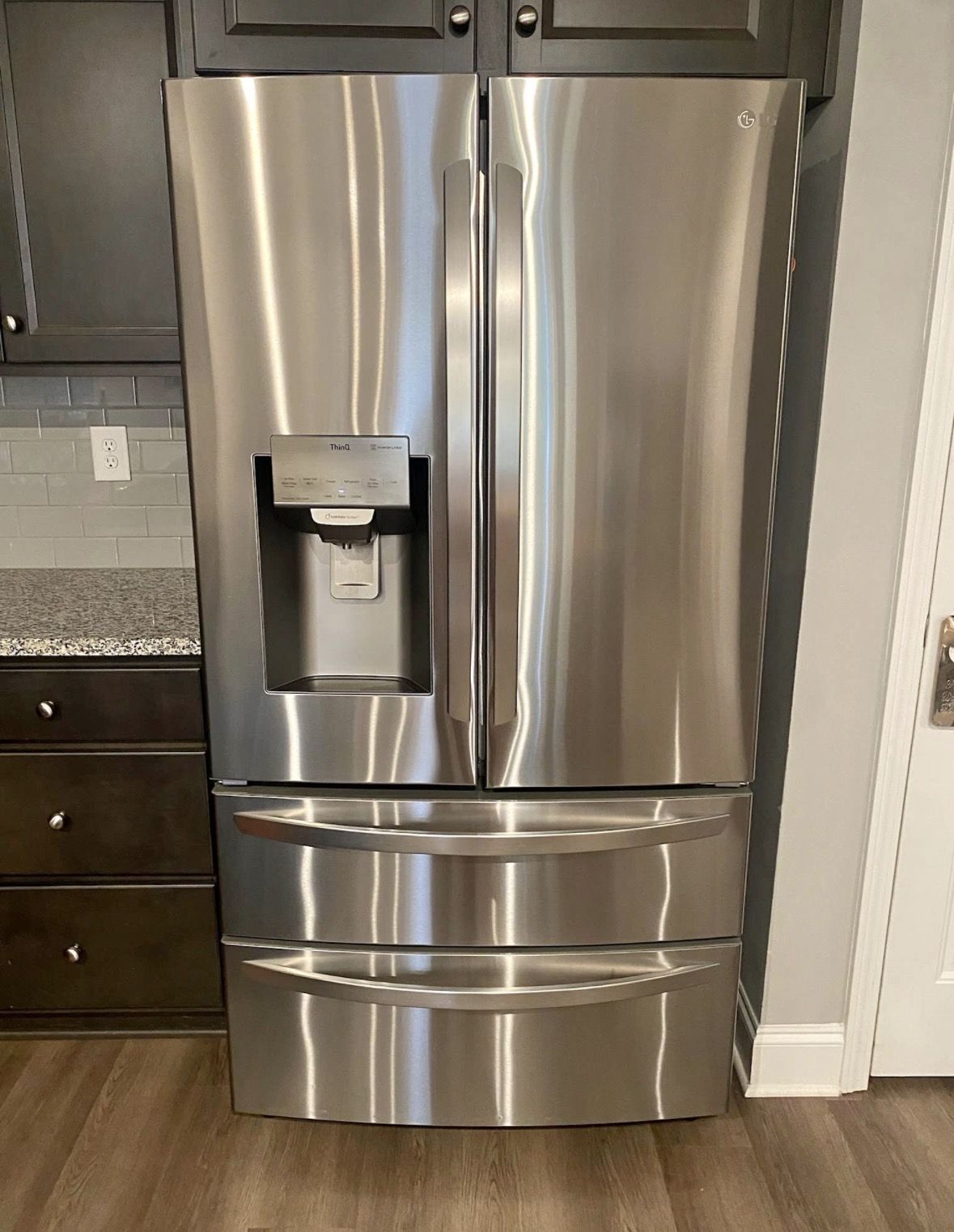 Selling a LG stainless steel French door refrigerator, model LMXS28626S. Large 28 cu ft capacity with external ice and water dispenser and dual freezer drawers. Approximate Dimensions: 35." W x 36." D x 69." H