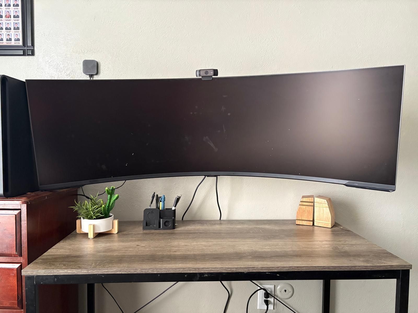 Only had it for 3 months. Bought it to use along with my new Desktop PC (which I listed for sale as well). Comes with all accessories and cables, flexible wall mount that i bought seperately (worth $60), plus I’m throwing in a 1080HD webcam (worth $80) Display Size: 57” Resolution: 7680 x 2160 Screen curvature: 1000R Aspect ratio: 32:9 Brightness (Normal): 420 cd/mỉ Contrast ratio Static: 2,500:1 Response Time: 1ms(GTG)