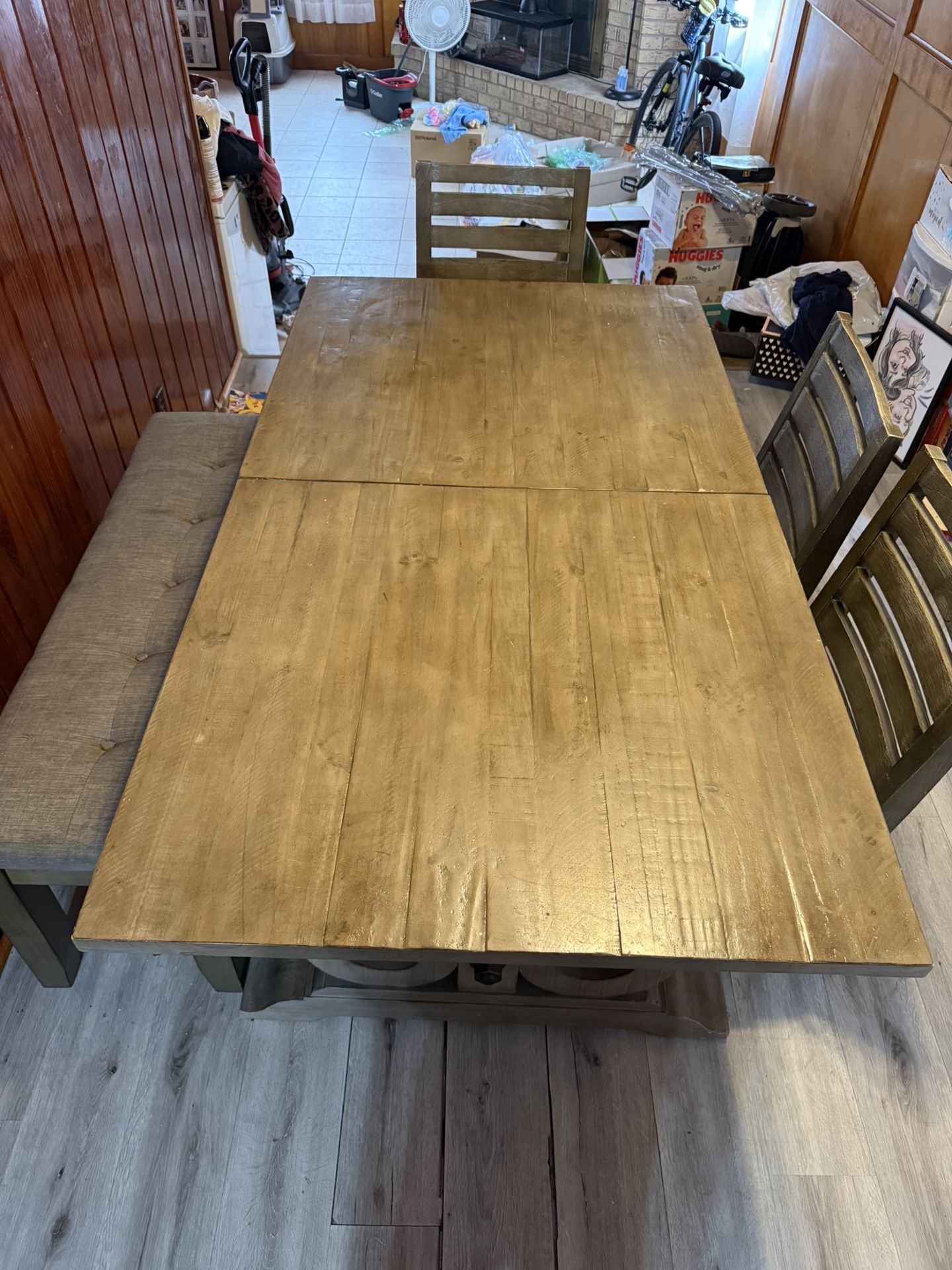 Farmhouse dining table, 3 chairs and a bench seating