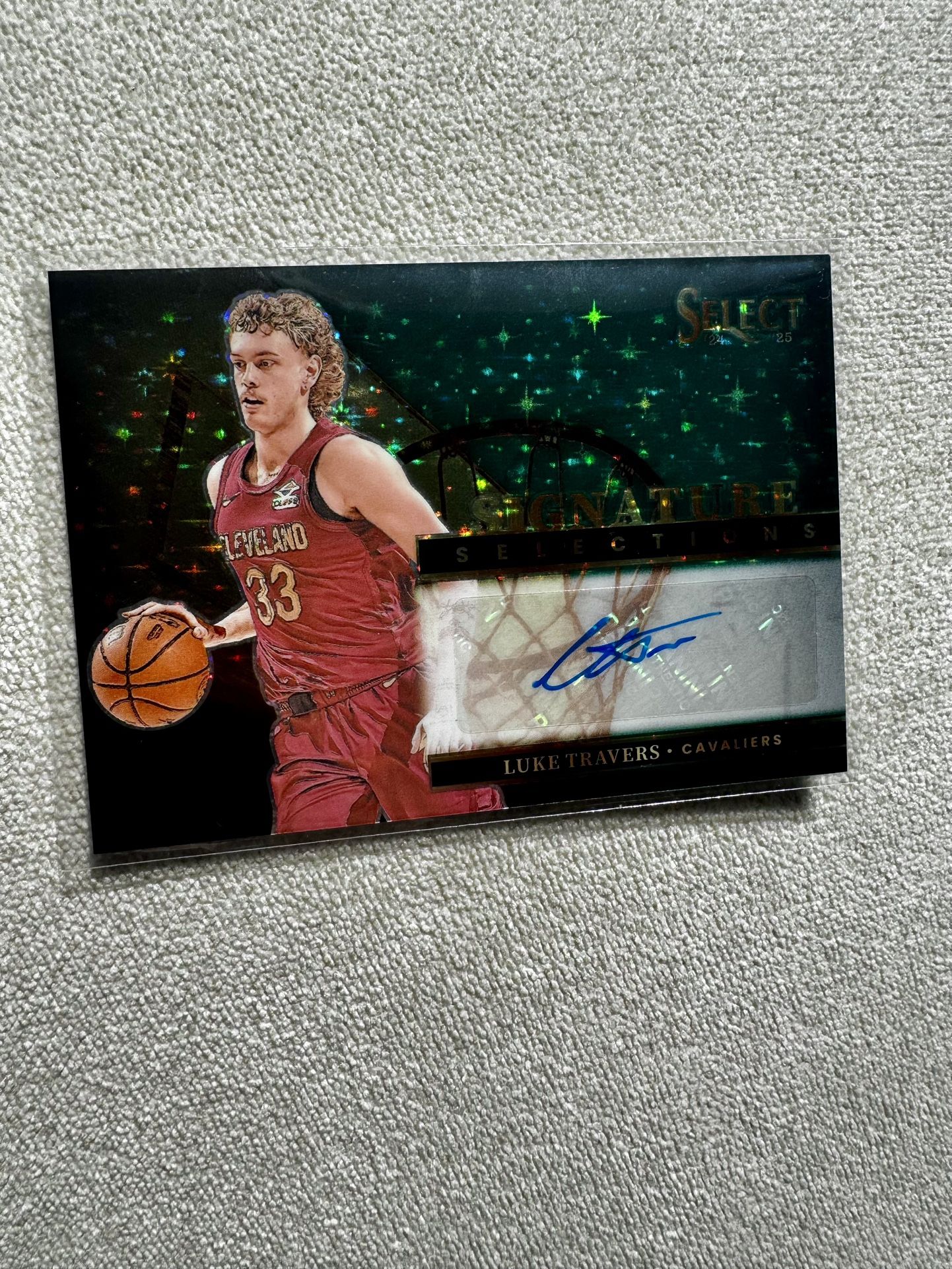 CASE HIT! The product is a 2024-25 Panini Signature Selections trading card featuring Luke Travers of the National Basketball Association (NBA). This card is a case hit, with a limited print run of 49 and an autograph from Travers in label/sticker format. Produced by Panini, the card is made of card stock and is in near mint or better condition. It is part of the original set for the 2024-25 NBA season and is authenticated by Panini Authentic. This collectible item is a valuable addition for basketball fans and card collectors.