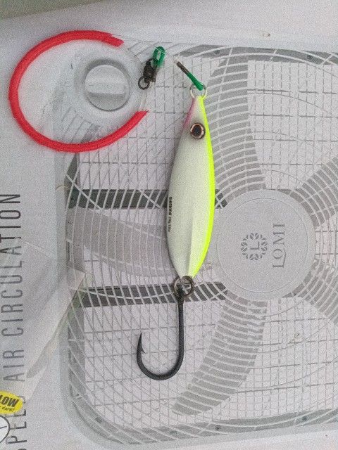 Pre rigged flatfall jig with 200lbs. leader and a single JHook and welded ring glow in the dark Price does not include shipping if I have to ship them