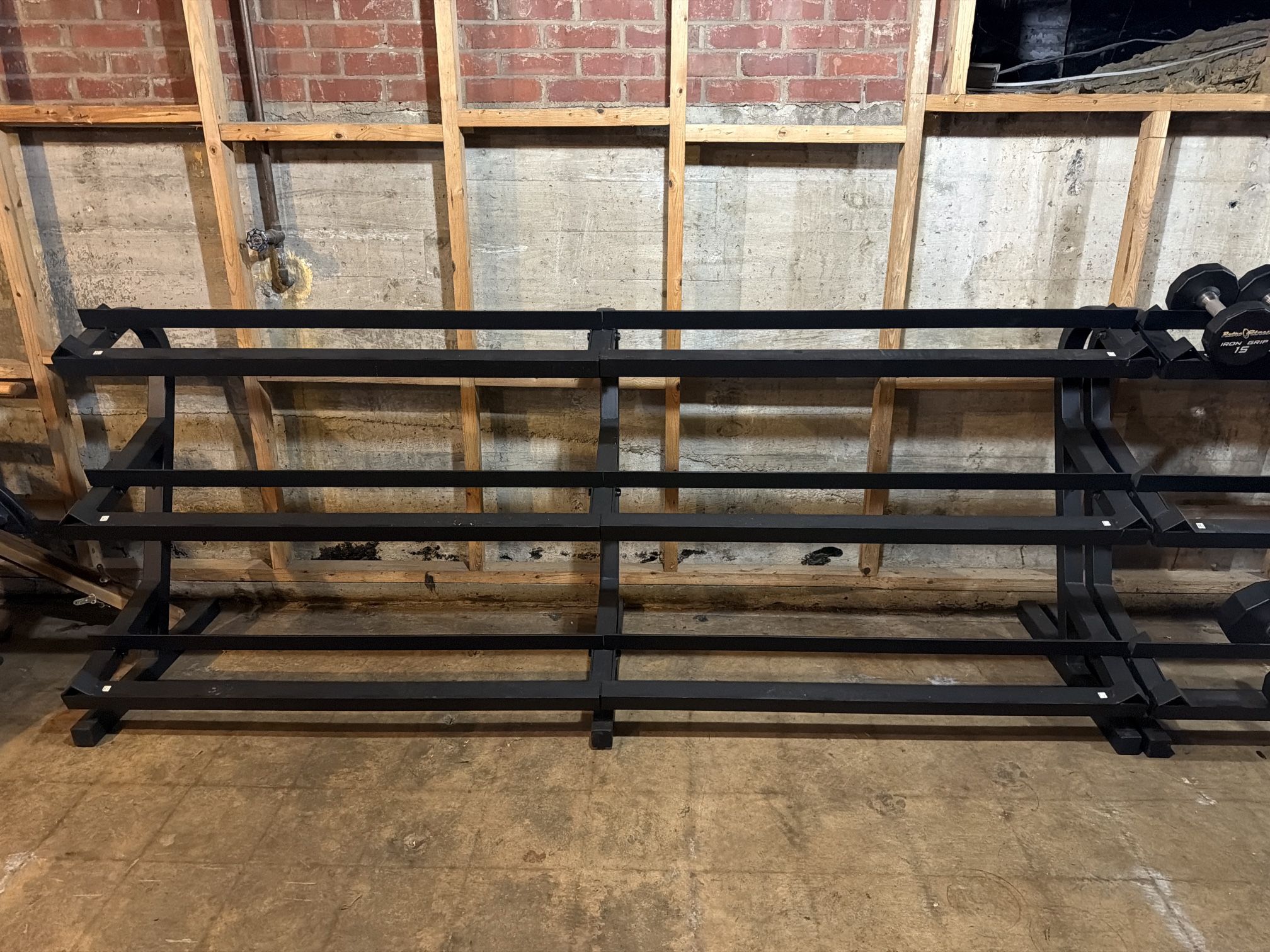 27"d x 37"h x 101" 3 Teir Dumbbell rack. Great Condition. $400 each Holds 3lbs- 100lbs hex dumbbells or 5-100 urethane