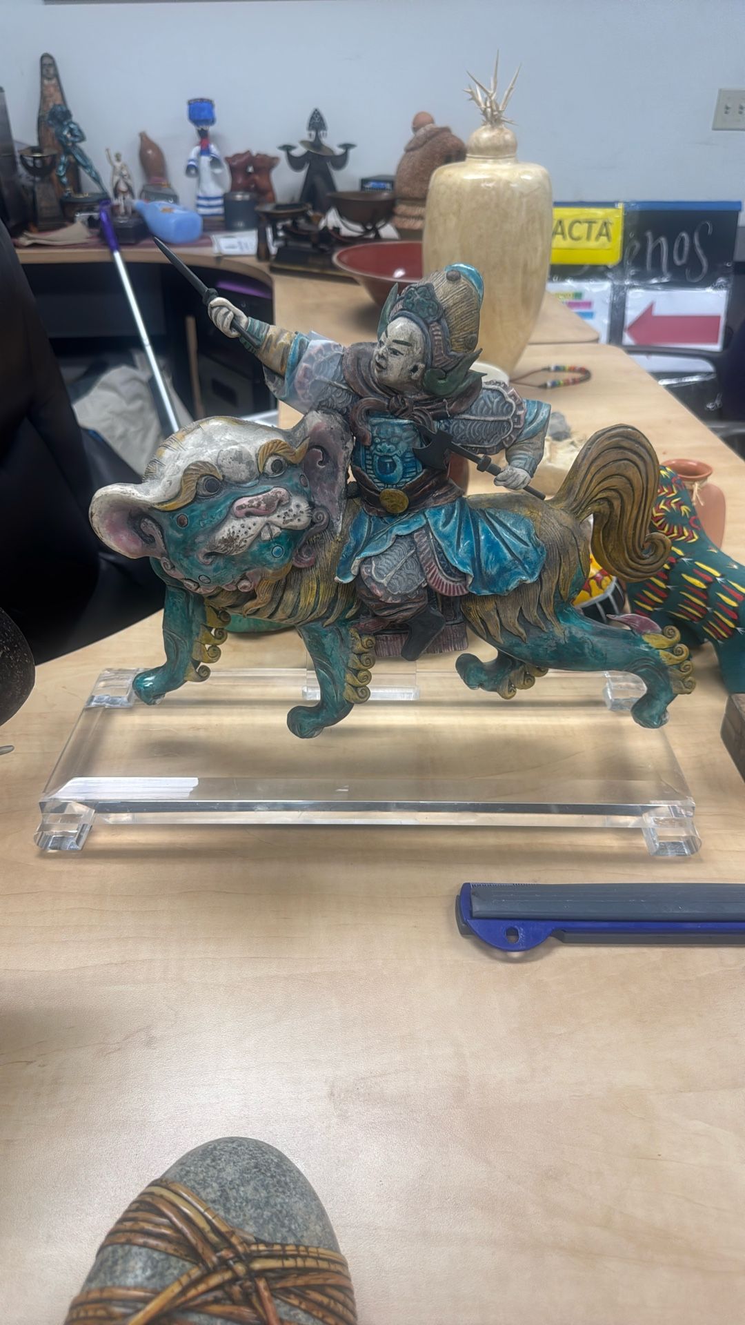 Sculpture – Warrior on Mythical Beast (12 × 14 in.) This vibrant and intricately crafted figurine features a warrior adorned in ornate armor riding a mythical creature that blends lion and dragon elements. With fierce expression, clawed feet, and a curled mane, the creature evokes strength and protection, while the warrior’s detailed attire and posture suggest ceremonial power and guardianship. • Dimensions: Approx. 12 × 14 inches • Materials: Painted resin or ceramic (please confirm) • Design Highlights:• Rich color palette: blue, red, gold, and black • Intricate textures and patterns on armor and creature • Mounted on a clear rectangular stand for display • Condition: Excellent, no visible damage • Style: Ideal for collectors of Asian-inspired art, fantasy figures, or cultural decor Perfect as a centerpiece, altar object, or collectible sculpture, this piece brings dramatic presence and symbolic depth to any space.