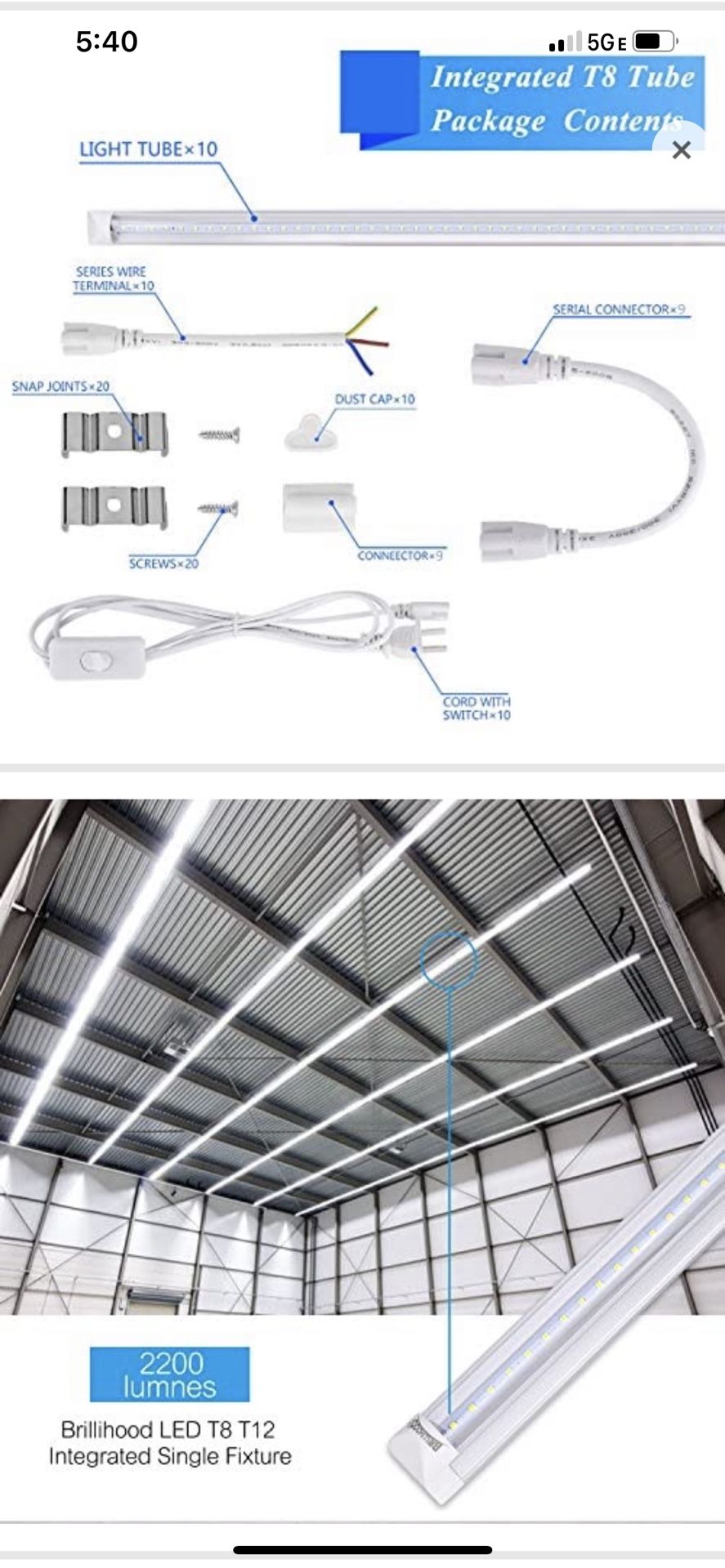 Brillihood LED T8 Integrated Single Fixture, 4FT, 20W, 6500K (Bright White), 2200lm, Utility Shop Light, Ceiling and Under Cabinet Light, Cooler Door Lighting Fixture, 10-Pack In box, never used Paid over $100