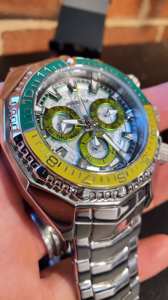 Case and Dial Case Size: 52mm Case Material: Stainless Steel Bezel Material: Stainless Steel Bezel Color: Blue, Gold Crown Type: Push Crystal Type: Flame Fusion Dial Material: Metal Case Back: Exhibition Movement Components: Swiss Caliber: 8040.N Function Type: Quartz Water Resistance Water Resistance: 1000m Band Material: Leather Tone: Black, Grey Length: 210mm Size: 26mm *****ORIGINAL INVICTA ***** *****NO TRADES ****