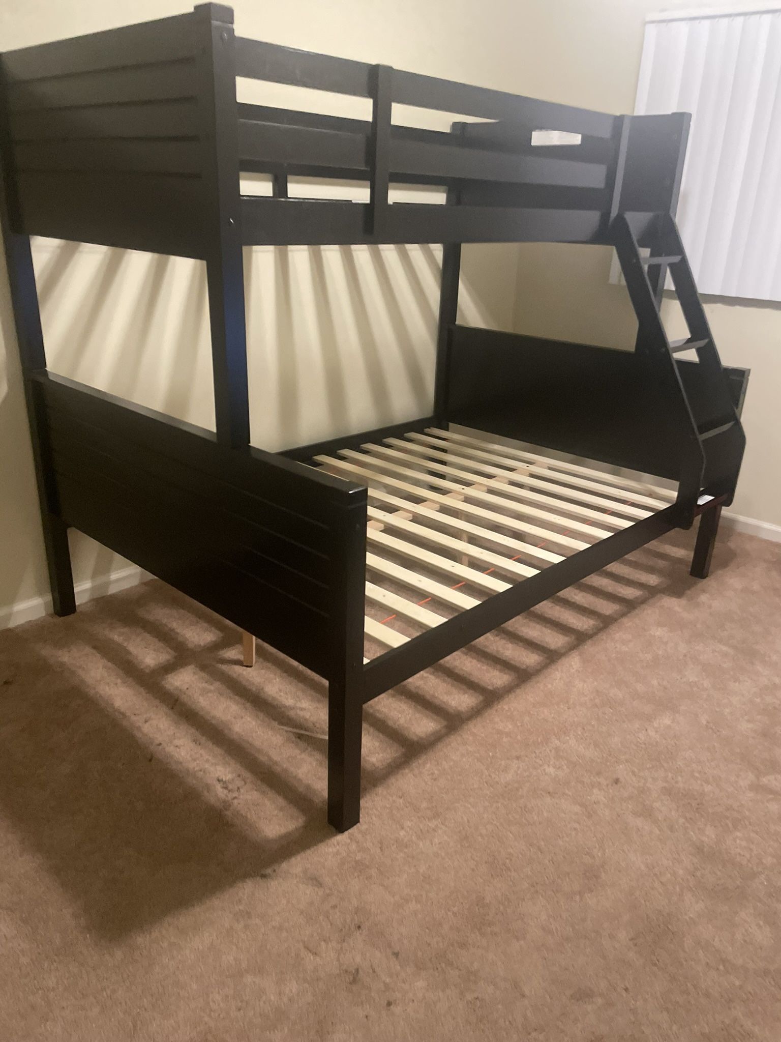 Twin/full bunk bed. Available in espresso & white. Assembly required. Assembly not included. Tax included. Free local delivery. $350 bunk bed only. $550 with mattresses.