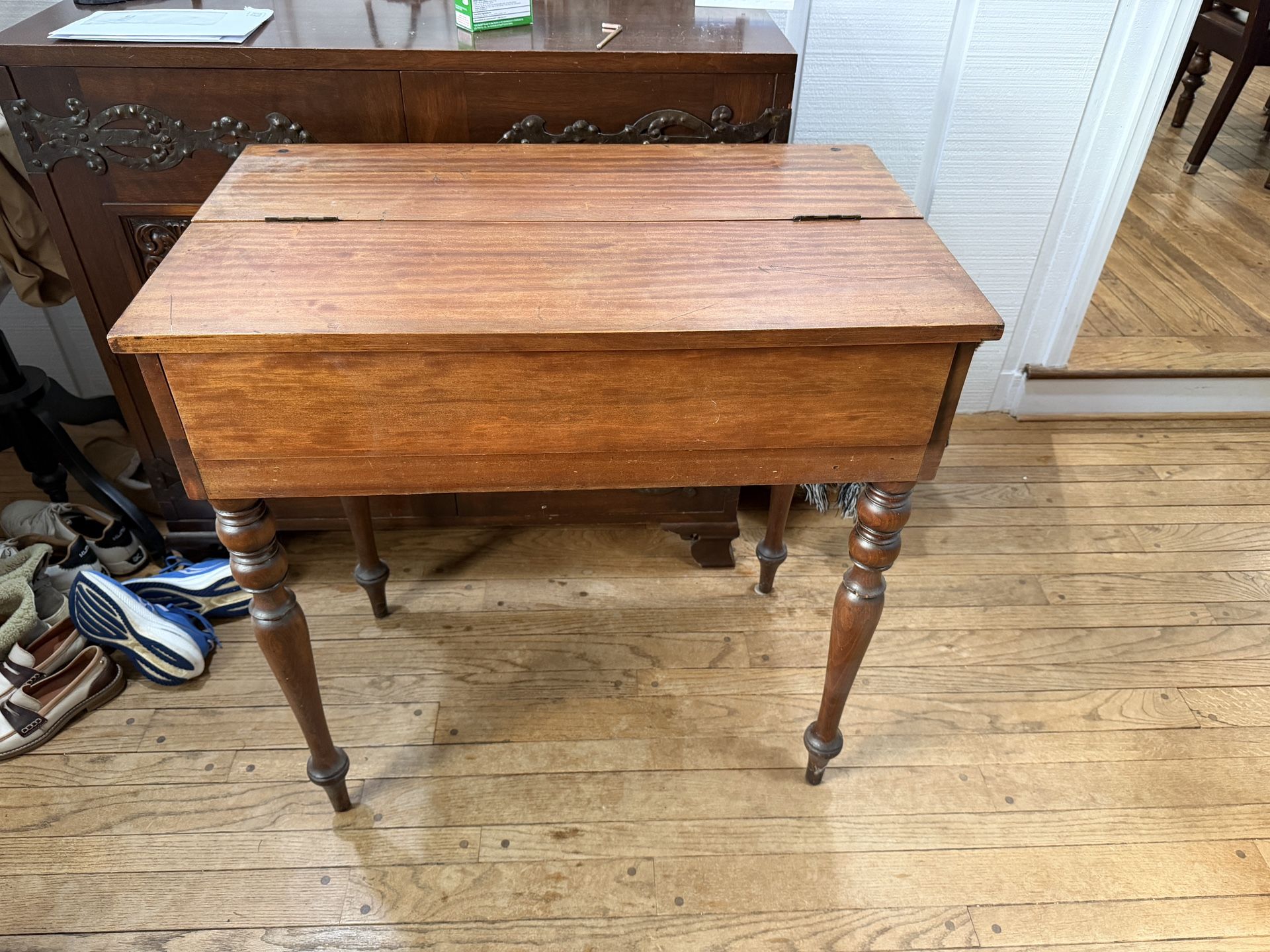 Antique desk or side table with flip top revealing pull out writing surface and storage. Roughly 32 inches tall and 30 inches wide