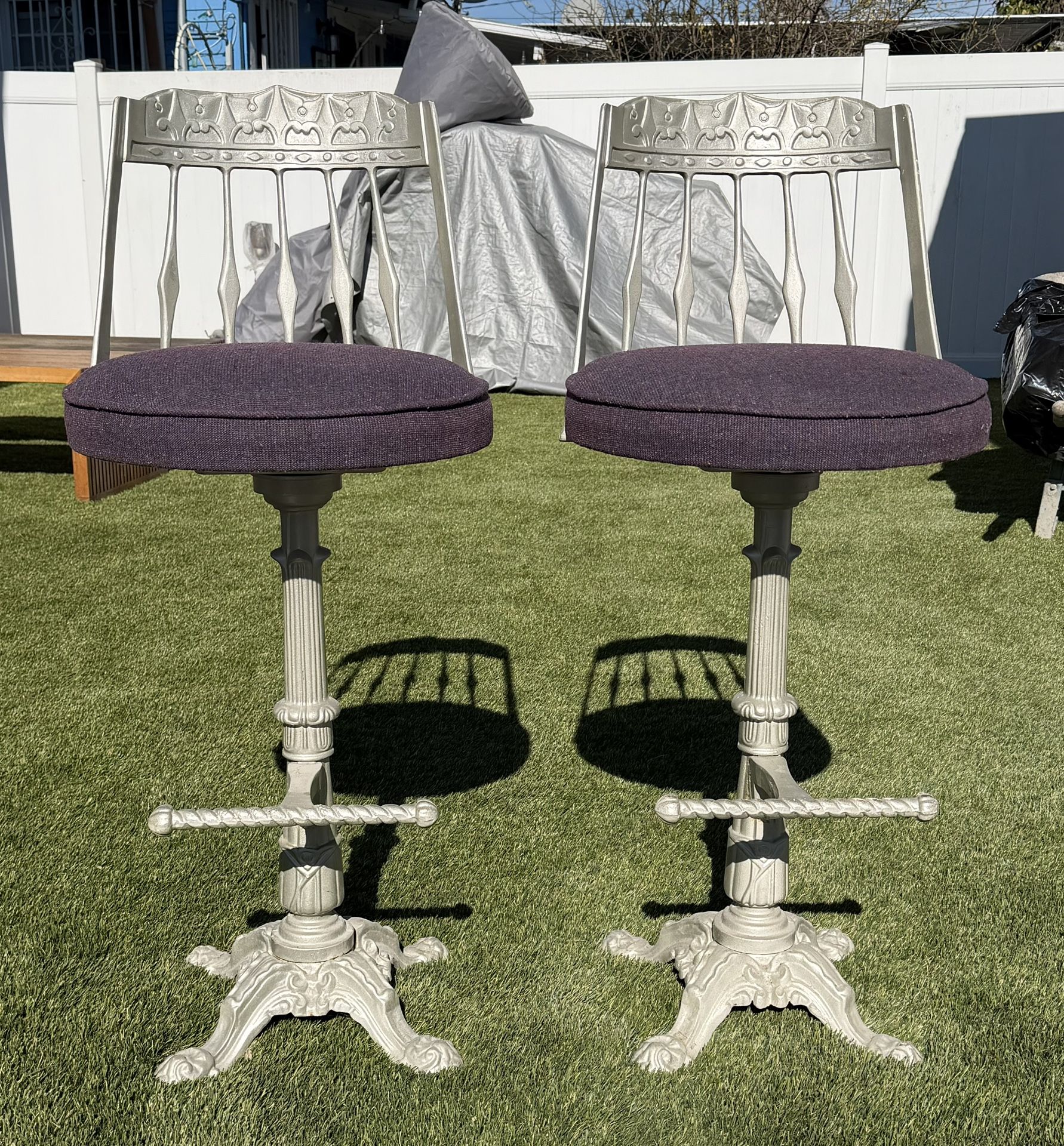 Set of two matching vintage bar stools. Feature ornate Victorian detailing including decorative cast backs, turned center columns, elegant footrests and sculptural paw-style feet. Estimated circa 1900. Very good condition. $225 each; total price $450. Only sold as a pair.
