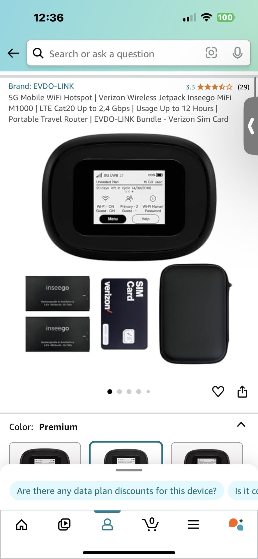 ************************************* Need to Buy Your own Data Plan ************************************* Verizon Inseego 5G and 4G LTE MiFi M1000 Ultra Wideband Mobile Hotspot WiFi device is portable and has a 2.4 inches Touch Screen display with 2x 4400 mAh batteries You can use Verizon Jetpack MiFi 5G M1000 mobile hotspot device data. Connect up to 15 WiFi hotspot devices and 1 wire device. Mobile hotspot device connect in 2.4GHz or 5GHz bands simultaneously Portable WiFi device Verizon jetpack MiFi hotspot M1000 Type C USB and RJ45 ethernet cable for your Desktop Computer WiFi hotspot help connect to mobile internet in remote areas. MiFi M1000 5G portable WiFi device supports all popular mobile carriers worldwide. 4G and 5G Hotspot device works WLAN 802.11 a/b/g/n/ac, dual-band Verizon sim card included BUT you need to buy your own data plan! Brand new inbox never used Pick up Cary IL 220 OBO