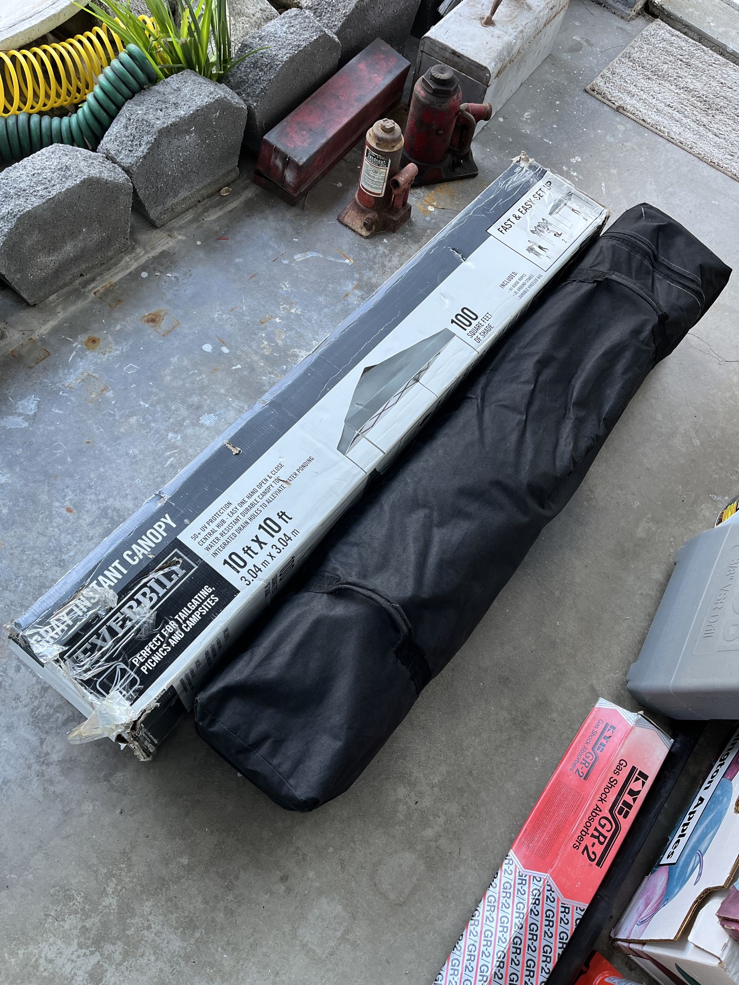 Selling this Everbilt 10 ft x 10 ft instant canopy, perfect for tailgating, picnics, and campsites. Features: Provides 100 sq. ft. of shade 50+ UV protection Central hub for easy one-hand open and close Water-resistant, durable canopy top Integrated drain holes to alleviate water ponding Fast and easy set up Includes: Canopy frame and top Durable wheeled storage bag