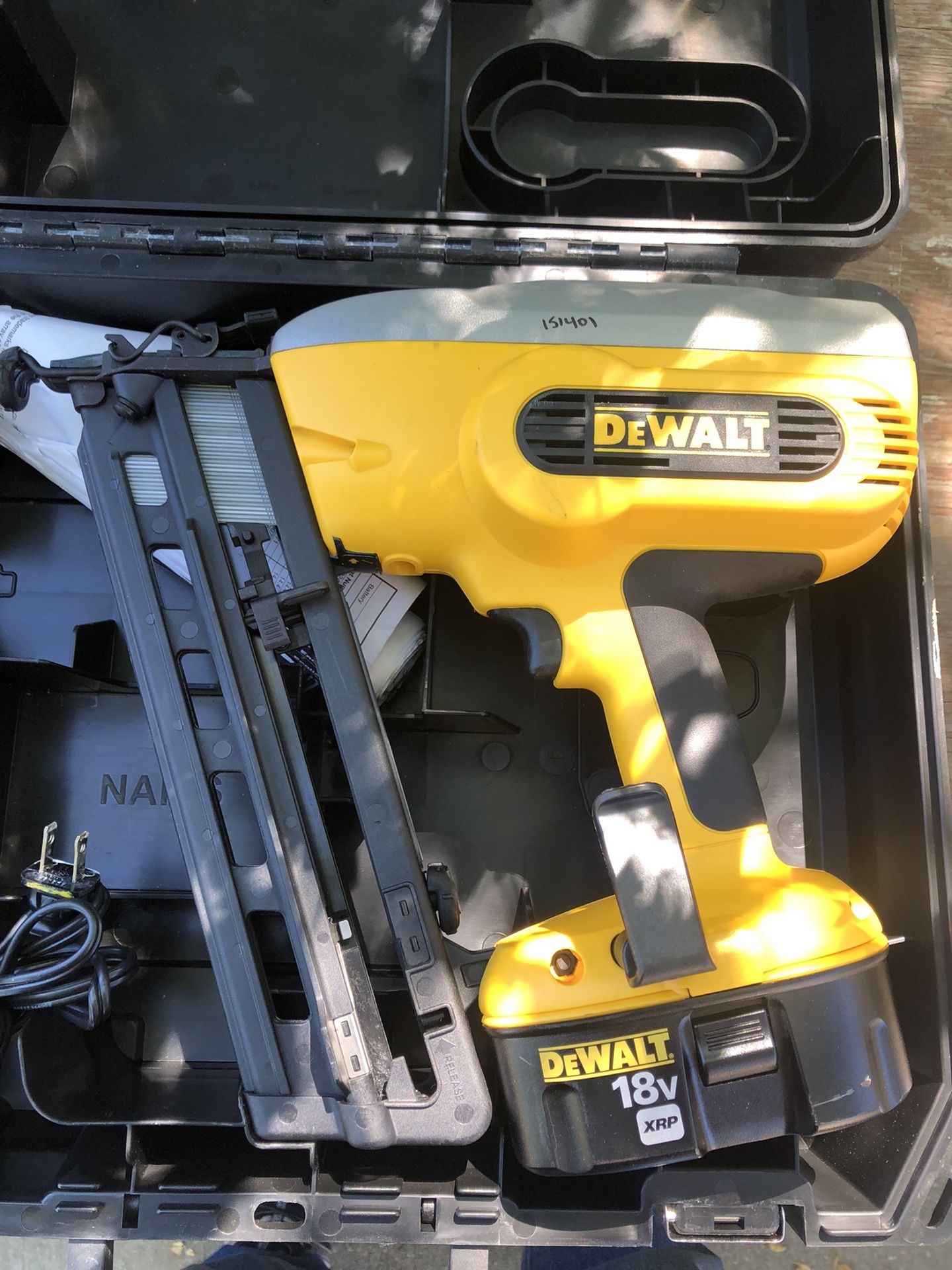 Dewalt 18V Model DC618 Finish Nailer with Charger and Battery. Uses 1-1/4” to 2-1/2” angled 16 guage finish nails. Also has Case and Instruction manual. The only use it has had was just to test it to make sure it worked great! And it does! Local pickup only. Cash only. No charge cards, no checks, no payment Apps.