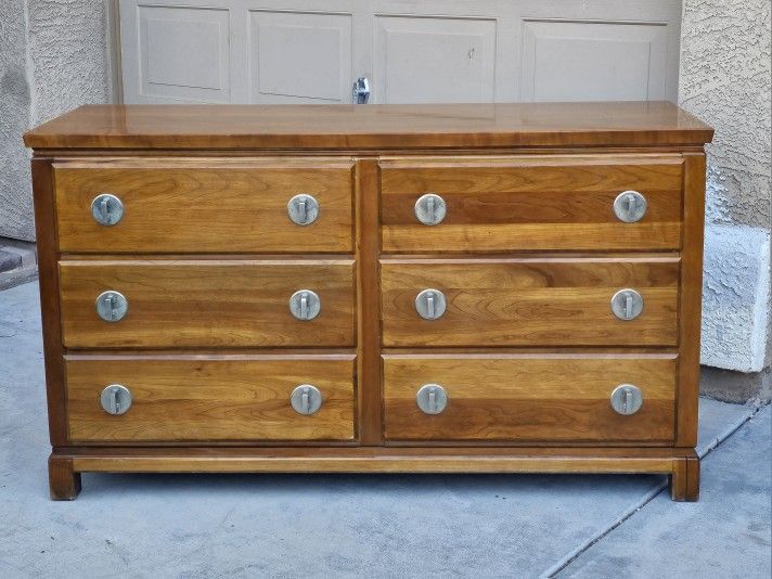 Mid Century Dresser by Crawford Furniture in good condition. Has 6 dovetailed drawers that work well. Featuring a walnut finish and satin metal pulls. 58×20×33